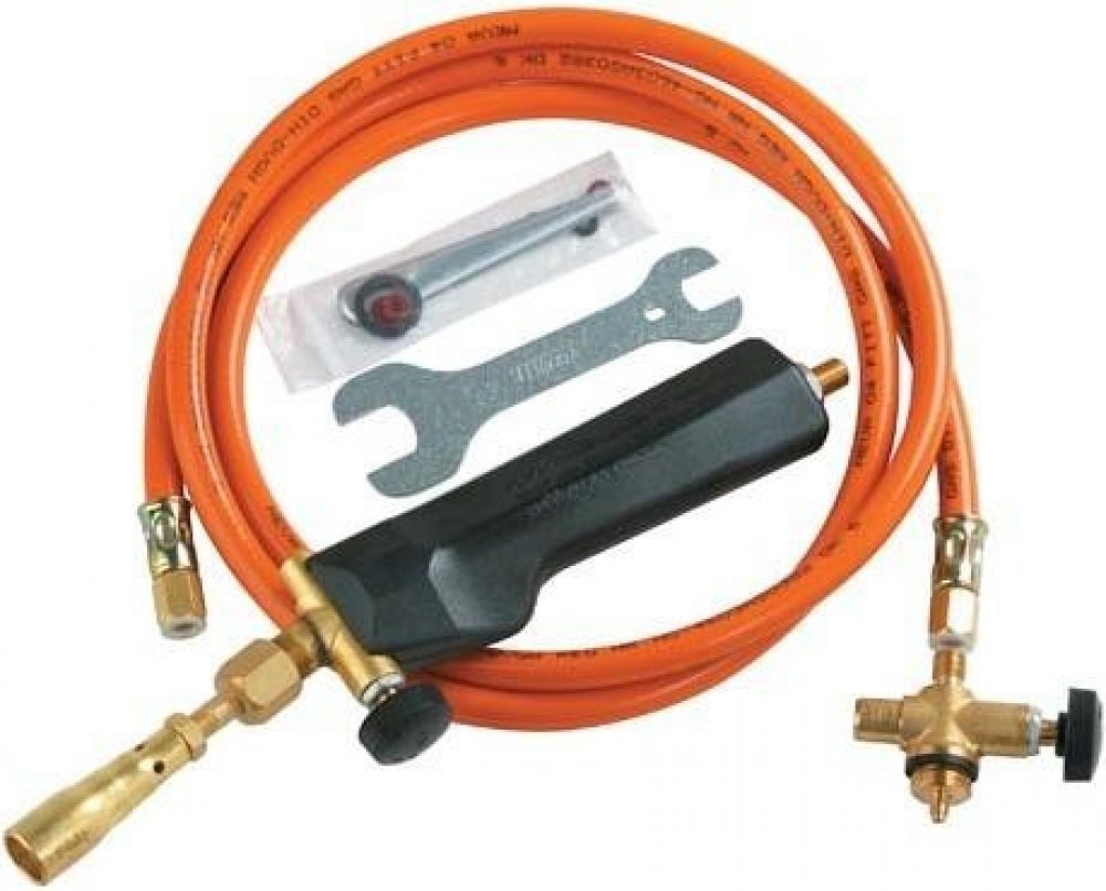 Balení obsahuje: rukojeť, plochý hořák, hadice, odtlačovací ventil 2kg a klíč na utažení spojů.