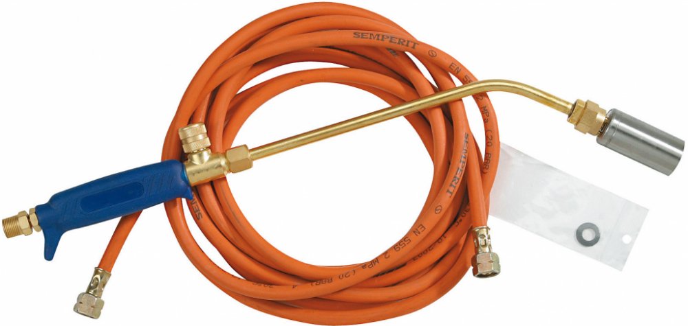 Stavební hořáky jsou určeny pro izolatérské a asfaltérské práce ve stavebnictví a pro ohřevy většího rozsahu. Hořákový komplet na propan-butan s prodlužovací trubkou a 5 m hadice. Kvalitní stavební plynový hořák s rychloregulací na rukojeti. Umožňuje nastavení udržovacího plamene a spuštění plného výkonu pomocí páky. Pro připojení 10 nebo 33kg propanbutanové lahve je potřeba regulátor NP 01011 nebo U4498, který není součástí balení. - výkon 11 kW, - hmotnost 1,8 kg, - spotřeba 900 g/hod, - rozměry 580 x 120 x 80 mm, - bez piezozapalování, - předpokládaná výdrž ( 10 kg ) - 11 hodin.