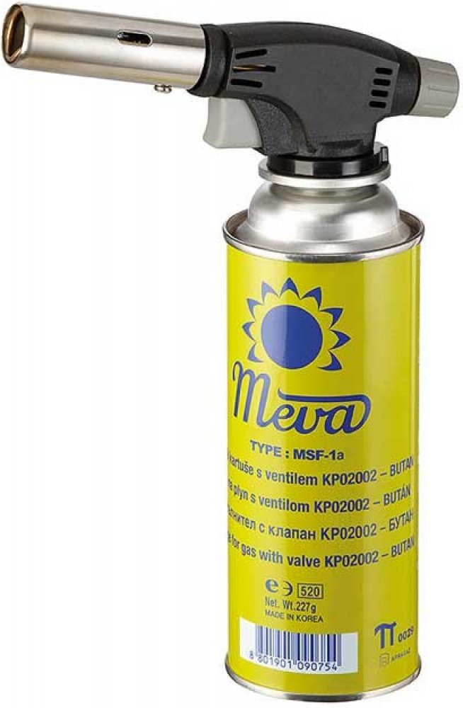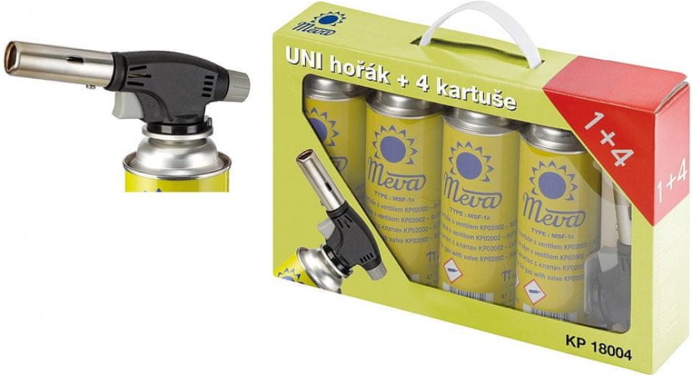 Universální hořák s piezoelektrickým zapalováním v praktickém setu se 4 kartušemi.