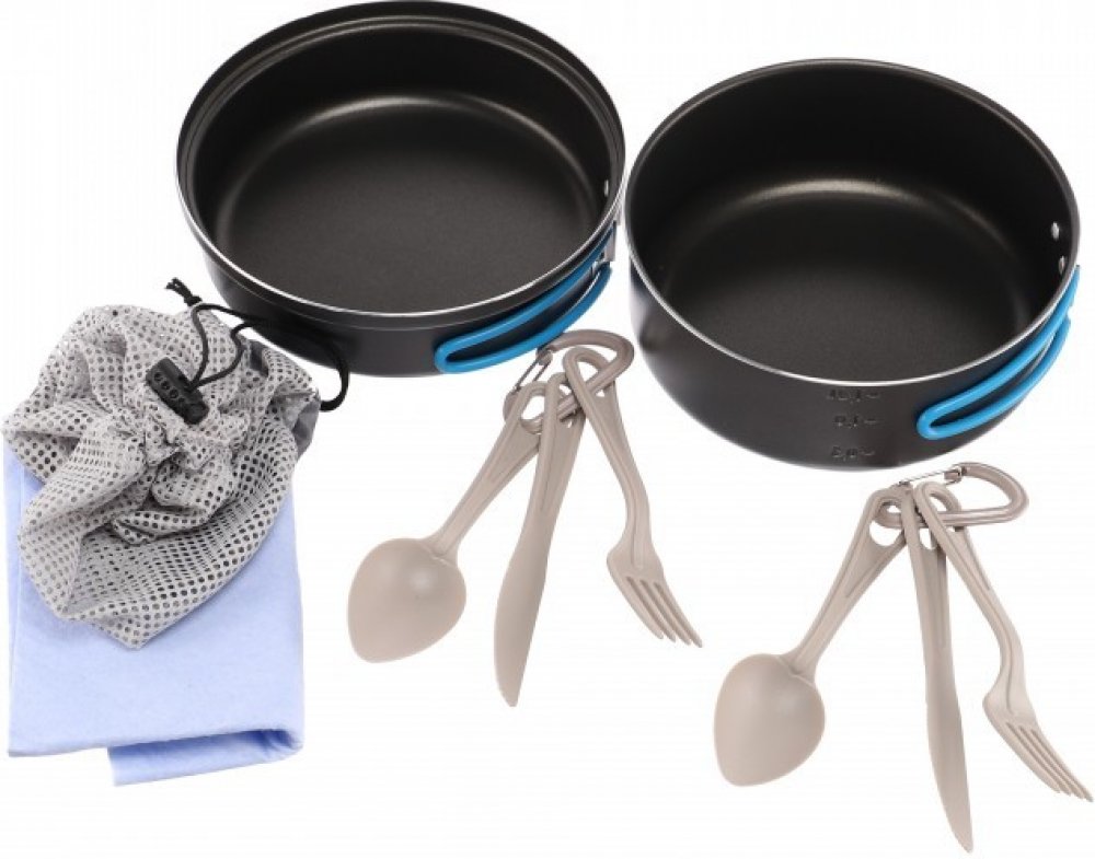 Campingová sada nádobí s nepřilnavým povrchem PTFE-vyrobena z povlakovaného hliníku.