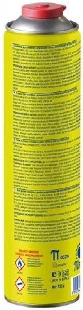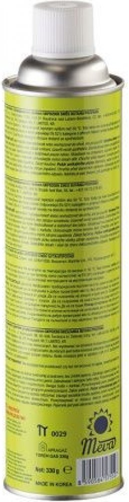 Meva Plynová kartuše na závit 330 g Meva Plynová kartuše na závit 330 g kartuše 330g se závitem 7/16 složení plynu Butan 45% + propan 27% + isobutan 28% rozměry výška 25 cm, průměr 6,5 cm EAN: 8590584575527