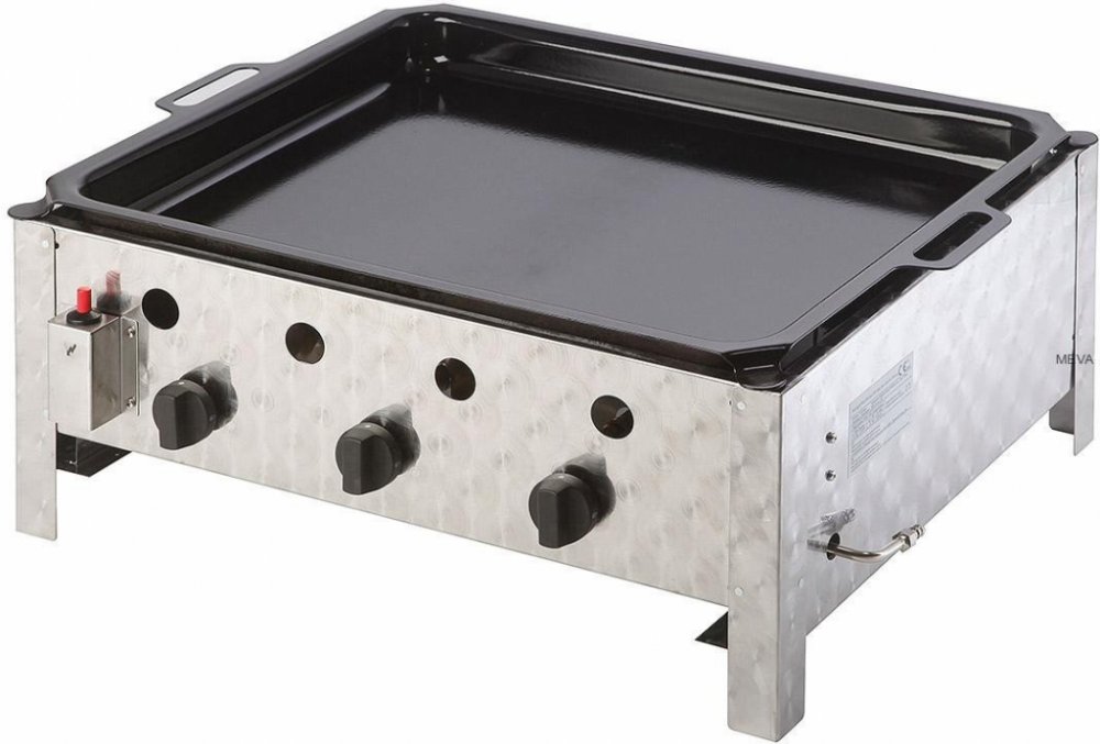 Nerezové provedení - broušená nerez, smaltovaná pánev - hloubka 5,5 cm. Termo pojistný ventil a piezzo zapalování. Tři nezávislé, regulovatelné plynové hořáky - piezzo zapalování.