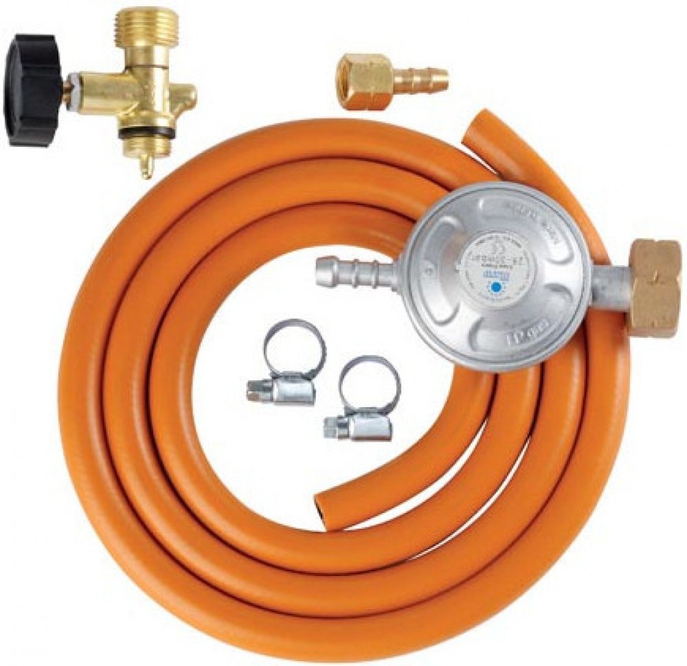 Set pro nízkotlaké vařiče Meva, 1,5m hadice, nátrubek G 1/4" L, 2 hadicové spony, regulátor tlaku, jednocestný ventil. Komplet pro přípojení plynových vařičů, teplometů, plynových kamen a dalších nízkotlakých plynových spotřebičů pokud jsou připojovány nátrubkem s maticí G 1/4" L. Sada příslušenství je určena pro připojení přes regulační ventil přímo do 10kg tlakové láhve a s použitím jednocestného ventilu i 2kg tlakové láhve.