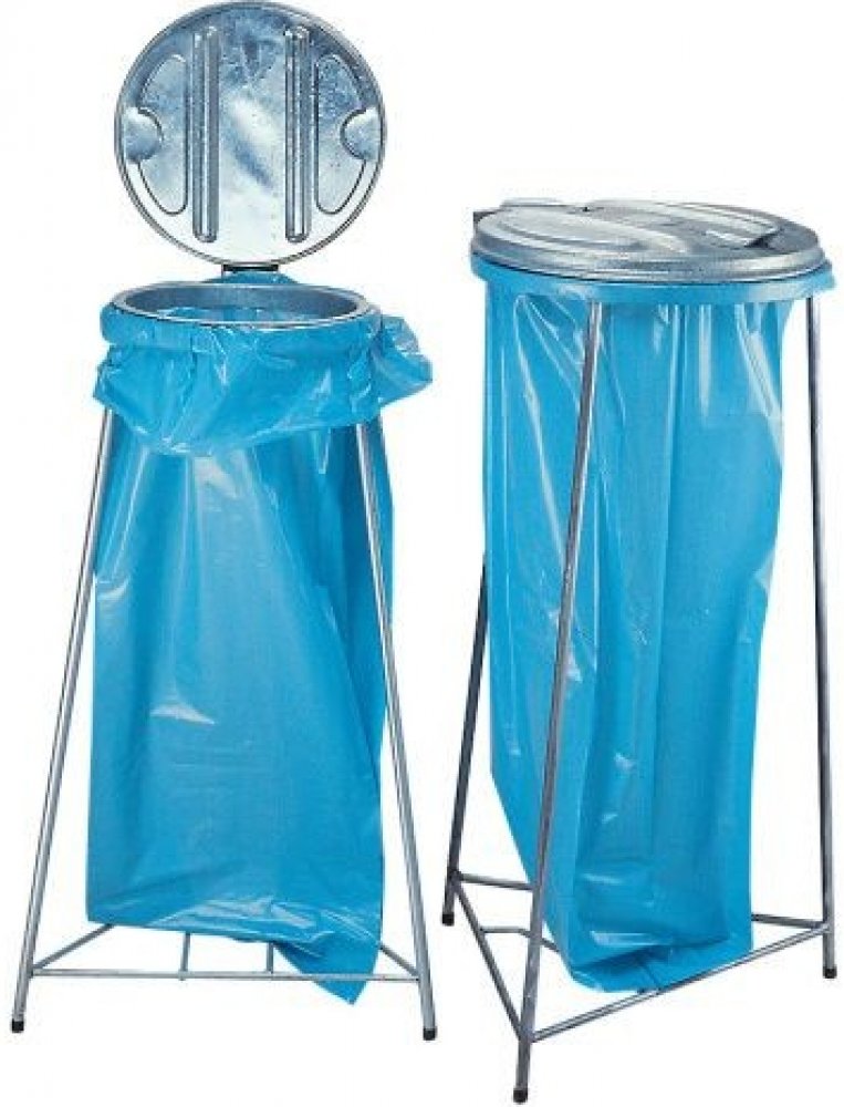 Ocelový stojan pro pytle o objemu 110 l. Vyrobeno z ocelového plechu jakostní třídy 11. Koš je konstruován jako trojnohý rám kuželového tvaru. Nosná část je tvořena třemi svislými stojinami, které jsou spojeny s horní a dolní profilovou obručí. Na horní obruči je pomocí držáku připevněno odklápěcí víko. Uvnitř horního profilu obruče je rozepřena pružná obruč sloužící k upevňování polyetylenových pytlů. Možnost dodání včetně pytle – typ 1077 (700 x 1100 mm).