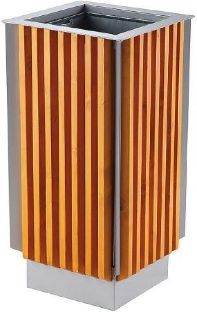 Venkovní odpadkový koš s dřevěnými prvky a ocelovým rámem o objemu 65 l. Konstrukce koše je vyrobena z pozinkovaného ocelového plechu. Obložení je vyrobeno ze smrkových dřevěných latí se sraženými hranami. Koš je vybaven vložkou z pozinkovaného plechu. Koše jsou vhodné pro venkovní umístění v parcích a jiných místech veřejné zeleně. Koš je vybaven dvěma příčkami ze spodu koše pro ukotvení k podkla...