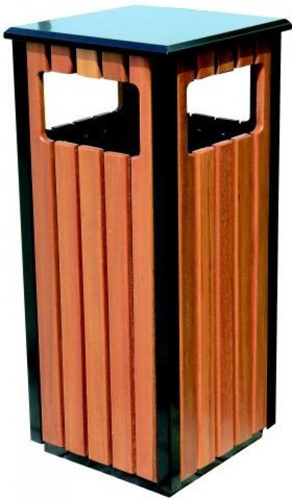 Vyrobeno z oceli s povrchovou úpravou práškové barvy a samolepky. Vybaveno vyjímatelnou vložkou z pozinkovaného ocelového plechu. Obložení je vyhotoveno ze zafoliovaných ocelových profilů s věrnou imitací dřeva. Provedení zajišťuje maximální barevnou stálost a mechanickou odolnost. Odolné vůči vlivům UV záření ze slunečního svitu. Vybaveno vhozy ze všech stran koše. Vršek je možné zvednout pro sna...