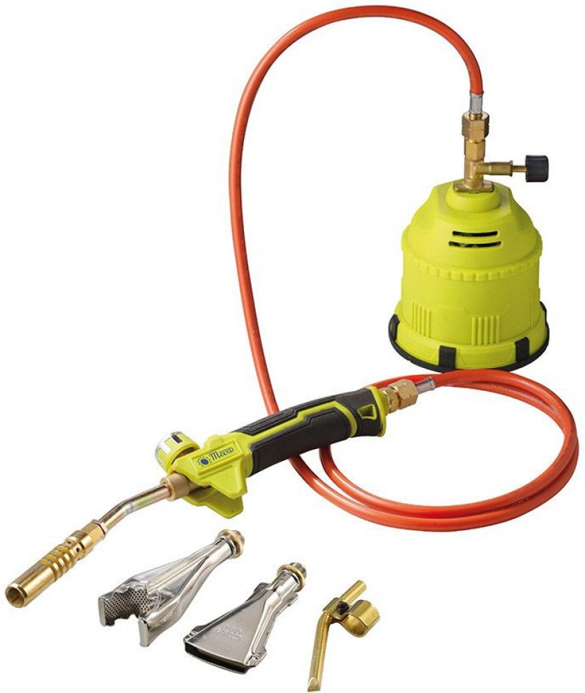 Pájecí sada Meva Handy UKP22001 o výkonu až 1,2 kW obsahuje rukojeť, hadici a 4 vyměnitelné hlavy hořáku: pájecí hořák, opalovací hořák, klešťový hořák a pájecí hrot.