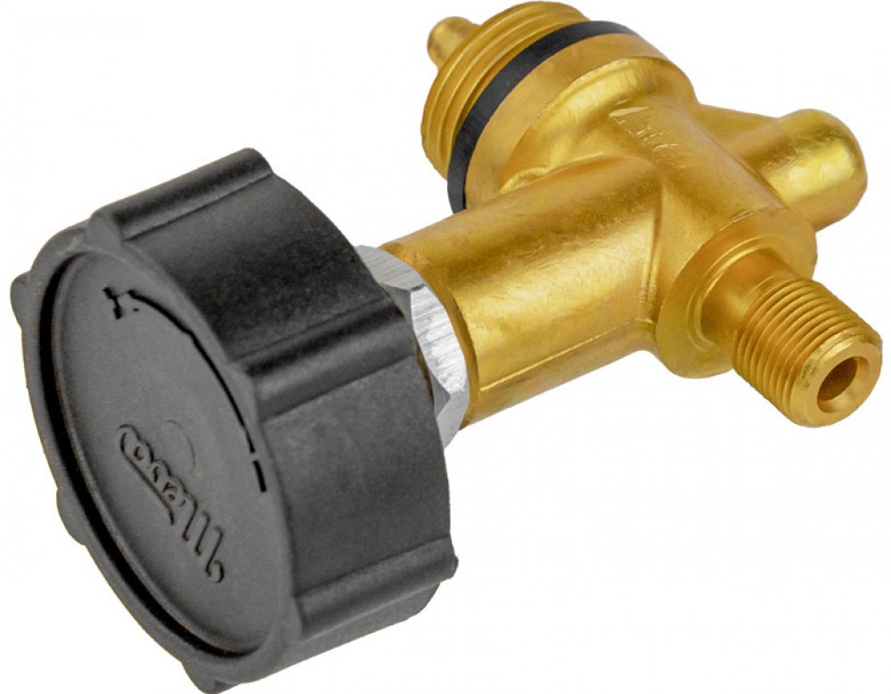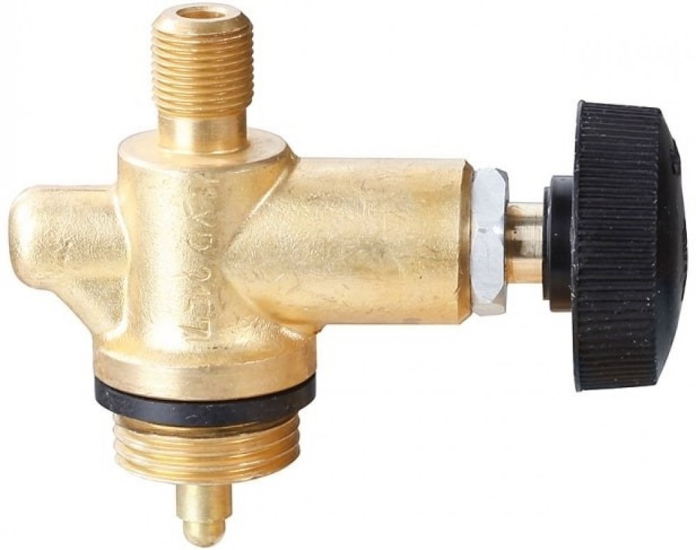 Jednocestný uzavírací ventil k 2 kg propan-butanové lahvi s výstupním závitem M9x0,75.