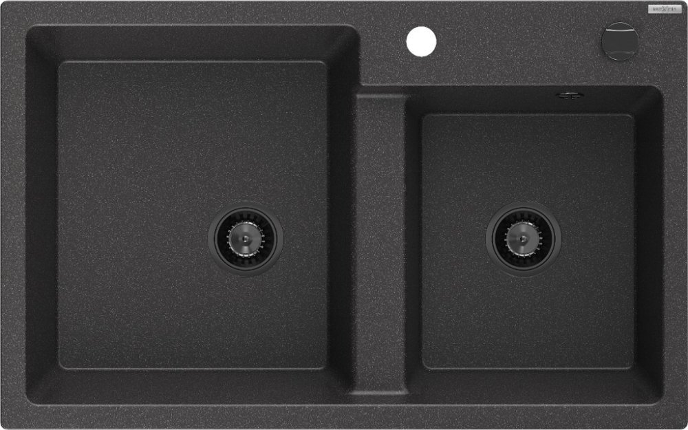 Technická data: Rozměr: 800 x 500 x 190 mm Hloubka komory: 180 mm (větší), 180 mm (menší) Rozměry komory: 440x387 mm (větší), 370x303 mm (menší) Průměr odtoku: ø90 mm Typ: 2-komorový Typ: Zapuštěné do pracovní desky Materiál: žula Barva: Skvrnitá černá Povrchová úprava sifonu: černá Přepadový otvor: Ano Otvor pro baterii: Ano Včetně automatického sifonu Vysoká odolnost proti poškrábání a změně bar...