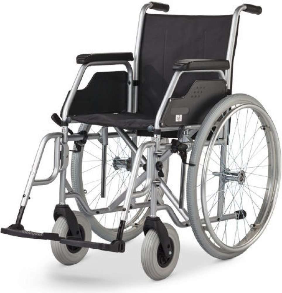 Standardní skládací mechanický invalidní vozík se stabilní a pevnou konstrukcí z ocelových trubek vhodný pro celodenní využití v interiéru i exteriéru.