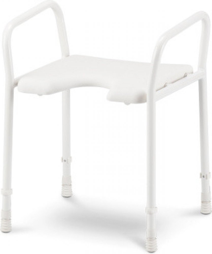 Sprchová sedačka (stolička) s hygienickým výřezem a područkami.