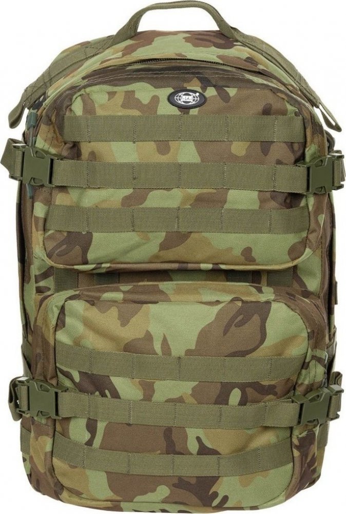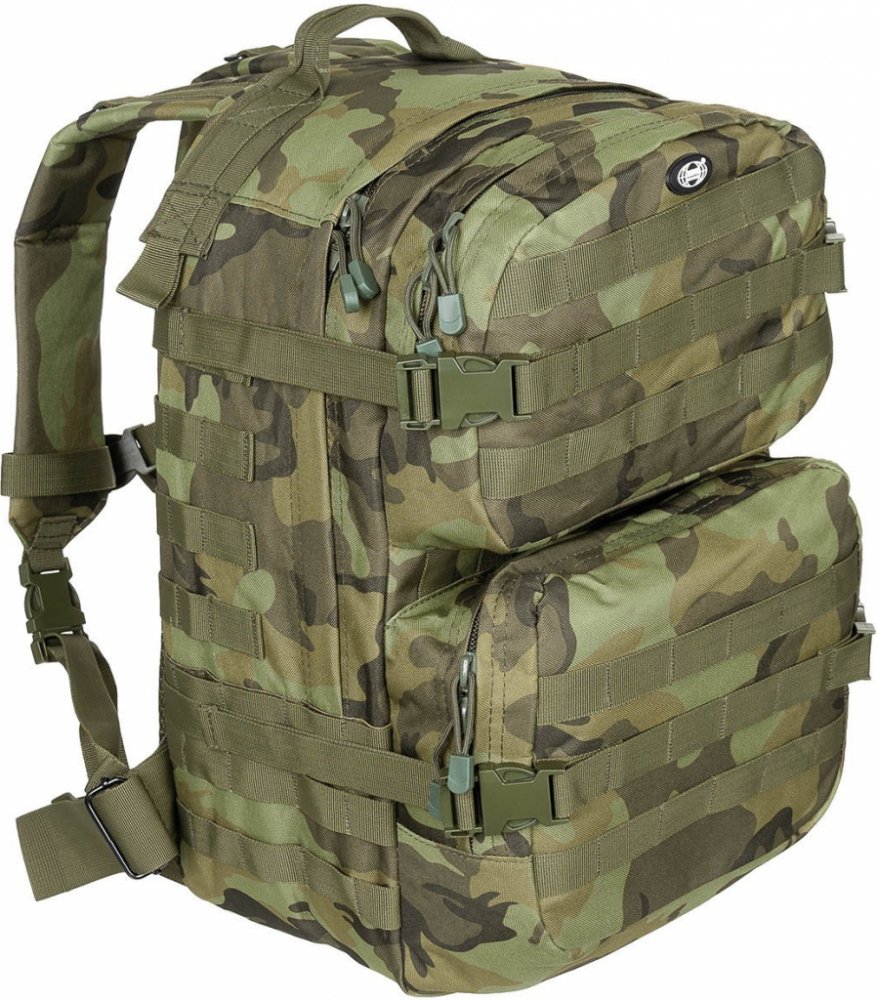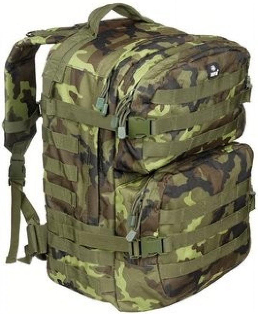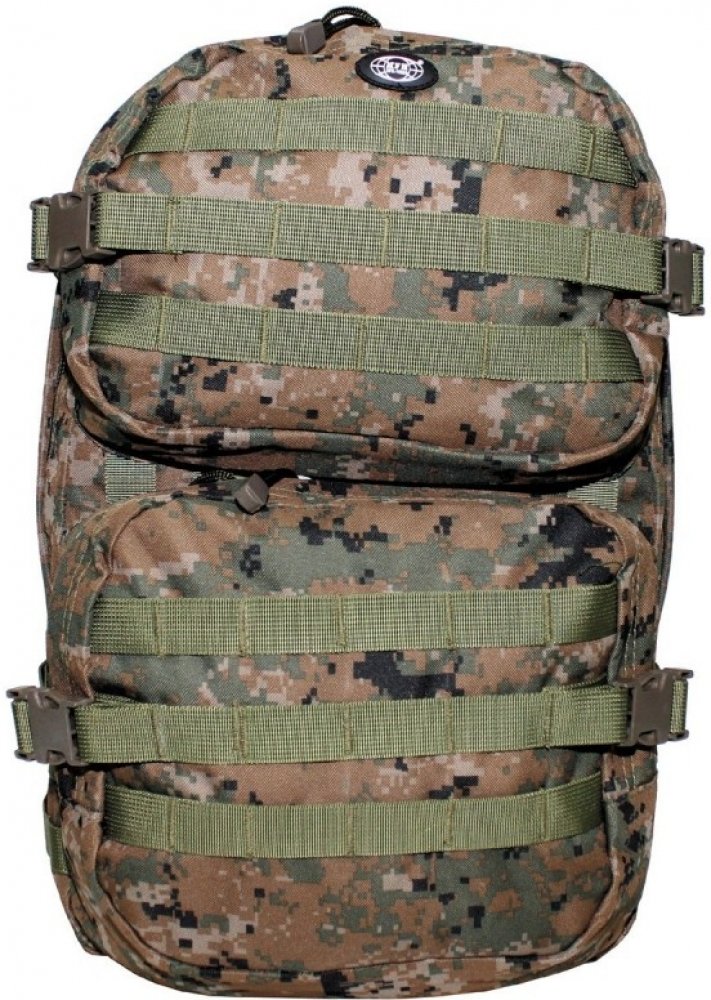 Střední batoh Molle je vyrobený z odolných materiálů 600D a PVC, díky čemuž je zajištěná jeho vynikající odolnost vůči mechanickému poškození. Batoh disponuje dvěma velkými hlavními kapsami na zip, dvěma velkými kapsami na přední části batohu (taktéž na zip) a kapsou určenou pro zásobník. Dále je batoh vybavený polstrovanými ramenními popruhy s D kroužky a prodyšnou zadní částí batohu.