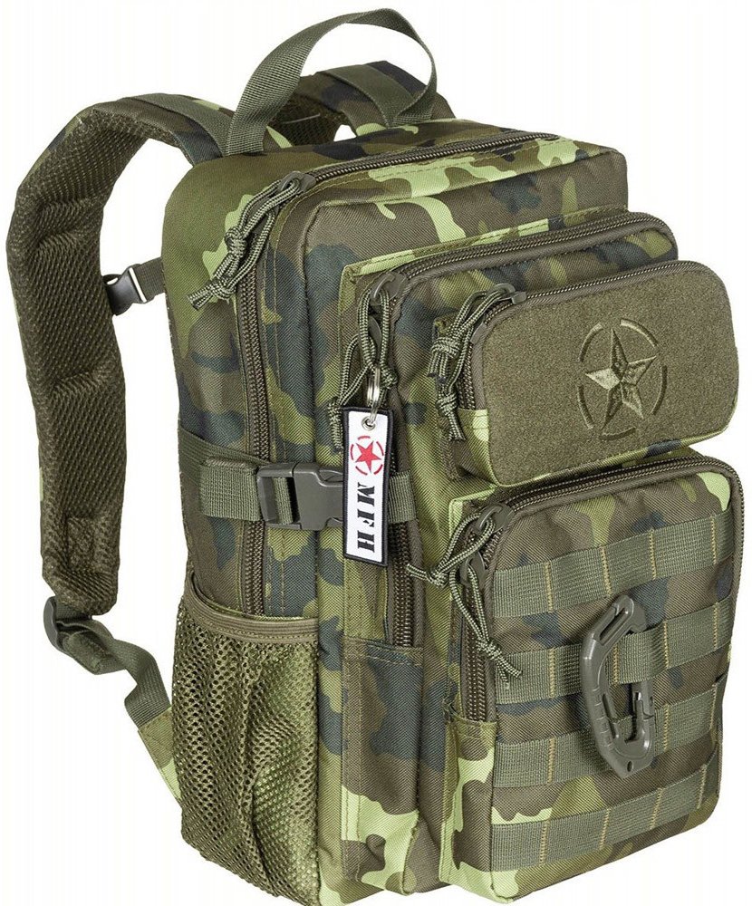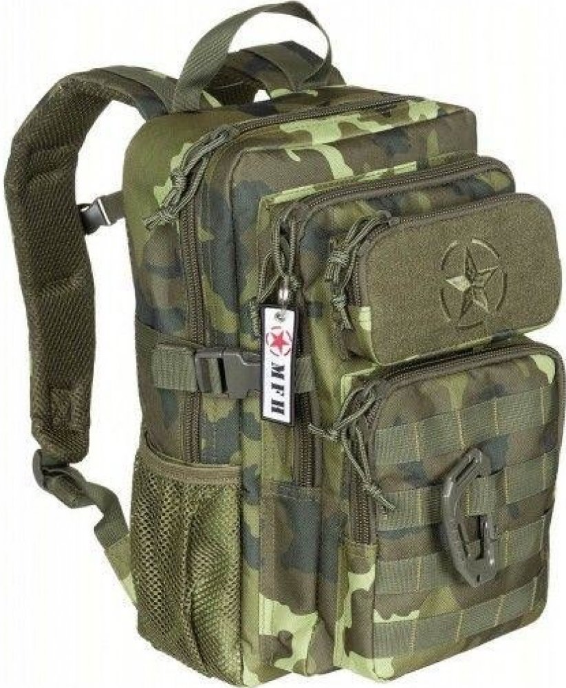 Dětský batoh Assault, vz. 95, 15 L, MFH Dětský batoh Assault "Youngster" od německého specialisty na vojenské vybavení MFH bude tím perfektním batohem pro vaše dítě. Tento praktický batoh s nastavitelnými rameny, hrudním popruhem a vyměkčenými zády je pak svým designem speciálně uzpůsoben pro potřeby vašeho dítěte. S celkovým objemem 15 litrů, rozměry 23 x 37 x 22 cm a hmotností 750 gramů se jedná o perfektní dětský batoh na veškeré výlety, túry, na tábor nebo na školu v přírodě. Tento batoh, který je dostupný i v dospělé verzi v podobě batohů MFH Assault 30 L, je nabízen v oblíbeném barevném provedení vzor 95, které asi není třeba představovat. O nadstandardní pohodlí při nošení se pak postará odměkčená, avšak velmi prodyšná, zádová konstrukce a měkčené ramenní popruhy. Ramenní popruhy a zabudovaný hrudní pás jsou pak samozřejmě i nastavitelné, díky čemuž se dá snadno a rychle dosáhnou utáhnutí batohu podle momentálních potřeb. Batoh nabídne celkem 4 kapsy jištěné dvousměrným zipem - hlavní velká kapsa, střední kapsa a dvě menší kapsy na přední straně batohu. Kapsy jsou pak vybaveny i o praktické doplňky, které ulehčí organizaci předmětů - vnitřní síťové kaspy, 4 očka na pera a podobné. Předek batohu je navíc doplněn o taktický, úchytný systém MOLLE. Na tu si vaše dítě bude moct připevnit praktické doplňky, jako je kompas, píšťalka nebo nějaké ty taktické kapsy. V základu je pak síť doplněna o plastovou karabinu s očkem na klíče. Dočkáte se pak i přívěšku na klíče s logem MFH, VELCO panelu a klasických, postranních, síťových kapes pro láhev na pití. Klíčové vlastnosti dětského batohu MFH Assault vz. 95, 15 L Univerzální dětský batoh s nastavitelnými, ramenními popruhy a hrudním pásem Odměkčená ramena a záda Barevné provedení vzor 95 Rozměry: 23 x 37 x 22 cm Kapacita: 15 L Hmotnost: 750g Materiál: 100% polyester Počet kapse na zip: 4 MOLLE vazba Plastová karabina Přívěšek MFH