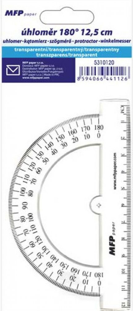 Školní plastový úhloměr. Možno měřit úhly do 180°, na spodní straně úhloměru je pravítko o délce 12 cm. Průměr úhloměru: 12,5 cm Barva: transparentní Pravítko je zdravotně nezávadné a neobsahuje ftaláty. Uvedená cena je za 1 ks. Dodáváme v plastovém balení se závěsem. Rozměr: 125mm x 73mm x 1mm (Š x V x H)