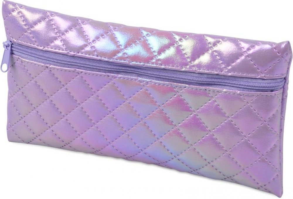školní penál/etue v perleťově fialové barvě, která vytváří duhové odlesky. Povrch je prošívaný ve vzoru kosočtverců, což dodává penálu strukturu a elegantní vzhled. Zip, který se táhne po celé šířce penálu, je sladěný s barvou penálu a je ve světle fialovém odstínu. Penál je plochý, obdélníkového tvaru, vhodný pro uložení psacích potřeb drobností nebo kosmetických předmětů. - není vybavený - zdrav...