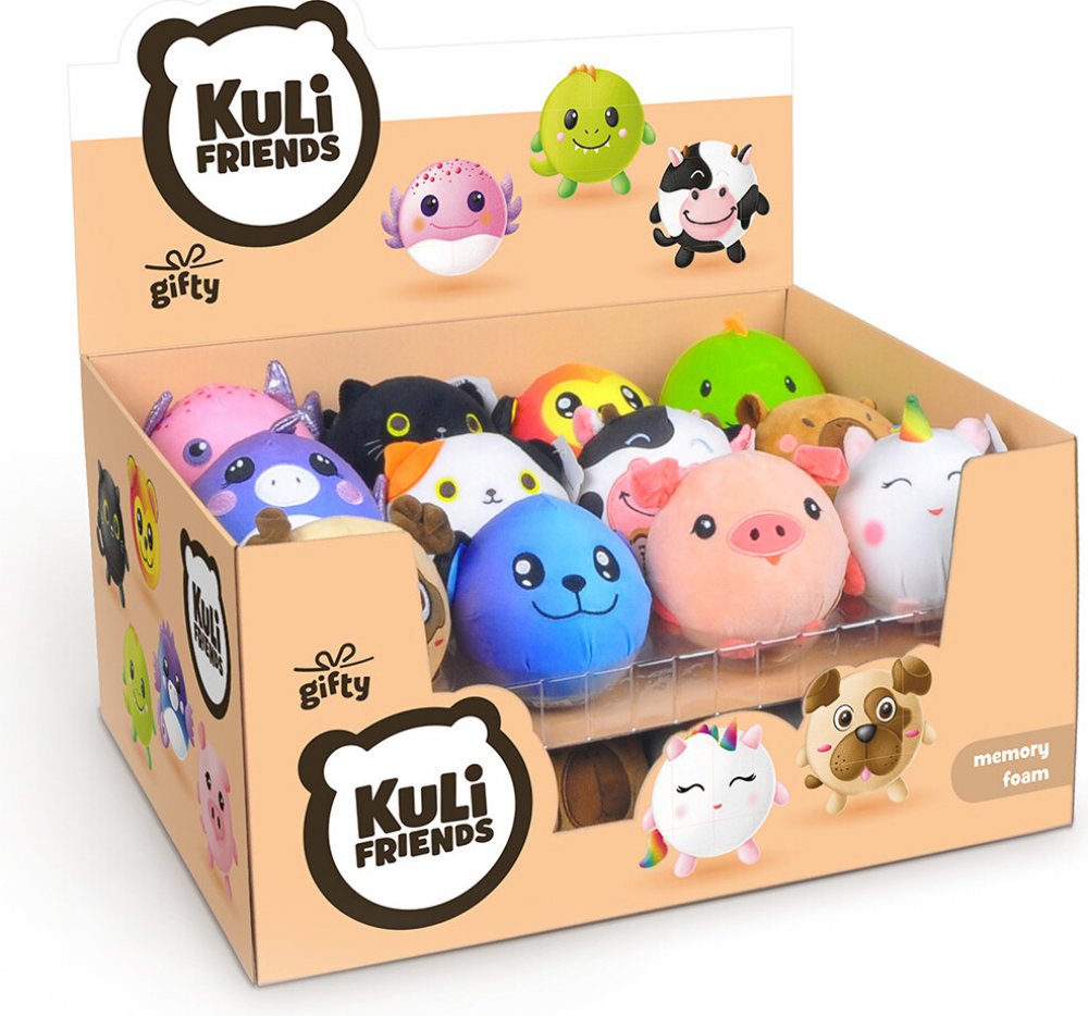 Objevte kouzelný svět Kuli Friends od značky Gifty – display plný radosti, barev a roztomilosti! Díky jemnému sametovému povrchu a výplni z paměťové pěny jsou nejen krásní na pohled, ale i uklidňující na dotek. Najdete tu veselé tvory, jako je zářivě modrý Axolotl, hravý dráček, roztomilý mopsík, nebo ikonický jednorožec s duhovou hřívou. Každý z nich má jemný sametový povrch a je vyplněný paměťovou pěnou, která se po zmáčknutí vrací zpět – takže jsou nejen hebcí, ale i úžasně příjemní do ruky.Perfektní na mazlení, jako dekorace nebo milý dárek – každý z plyšáků vyniká jedinečnými detaily, které z něj dělají neodolatelného společníka pro děti i dospělé.
