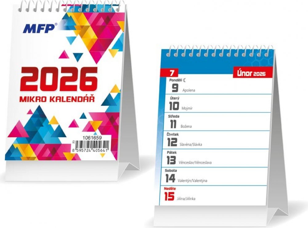 Stolní týdenní kalendář pro rok 2026 s názvem Mikro. Vhodný pro zapisování důležitých poznámek, k organizování různých událostí každodenního života.TYP KALENDÁŘE: stolní OBRÁZKY: nejsouV KALENDÁŘI NAJDETE:- státní svátky, významné dny- prostor na poznámky - malý přehled roku 2026, 2027- plánovací kalendář 2026- jmeniny- název měsíce- slunovraty- počet týdnůVazba: vinutá spirálaKalendárium: týdenní...