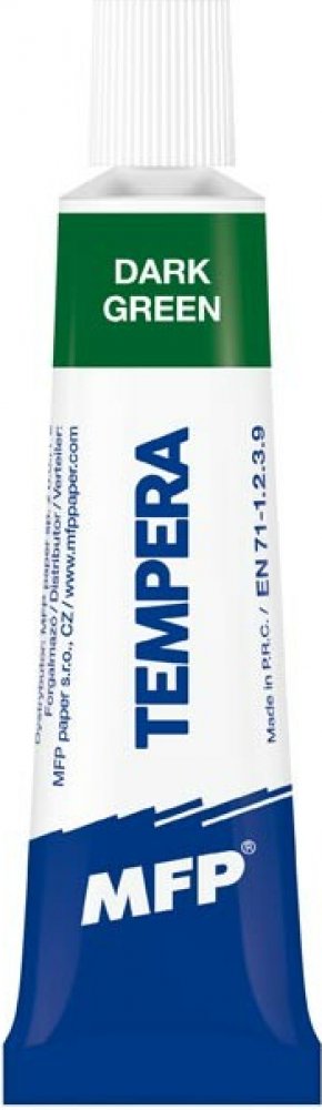 Temperová barva MFP kusová - tmavě zelená. Namalujte si s dětmi obrázek pomocí temperových barev, které vynikají jasnou barevností. Děti můžou malovat štětcem, ale i prsty.- vysoké krycí vlastnosti- žádné toxické látky- pro školní a hobby použití- tempera je v hliníkové tuběBarva: černáObsah barvy v jedné tubě: 12 mlVAROVÁNÍ:Nevhodné pro děti do 3 let. Nebezpečí spolknutí malých částí.EN71 - 1,2,3...