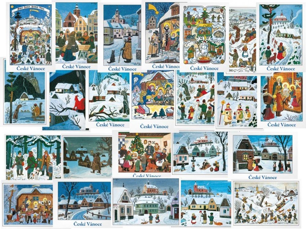 Vánoční pohlednice Josef Lada V této sadě pohledů najdete nejznámější Vánoční obrázky Josefa Lady. Malíř Josef Lada Vás ve svých obrázcích zavede do zasněžených Hrusic, na návsi potkáme ponocného, u potoka sáňkují děti a nesmí chybět ani Ladův tradiční betlém. Na zadní straně těchto pohledu není předtištěný text s přáním. Dodáváme ve 2 mixech po 12 motivech. První mix je s textem České Vánoce, dru...