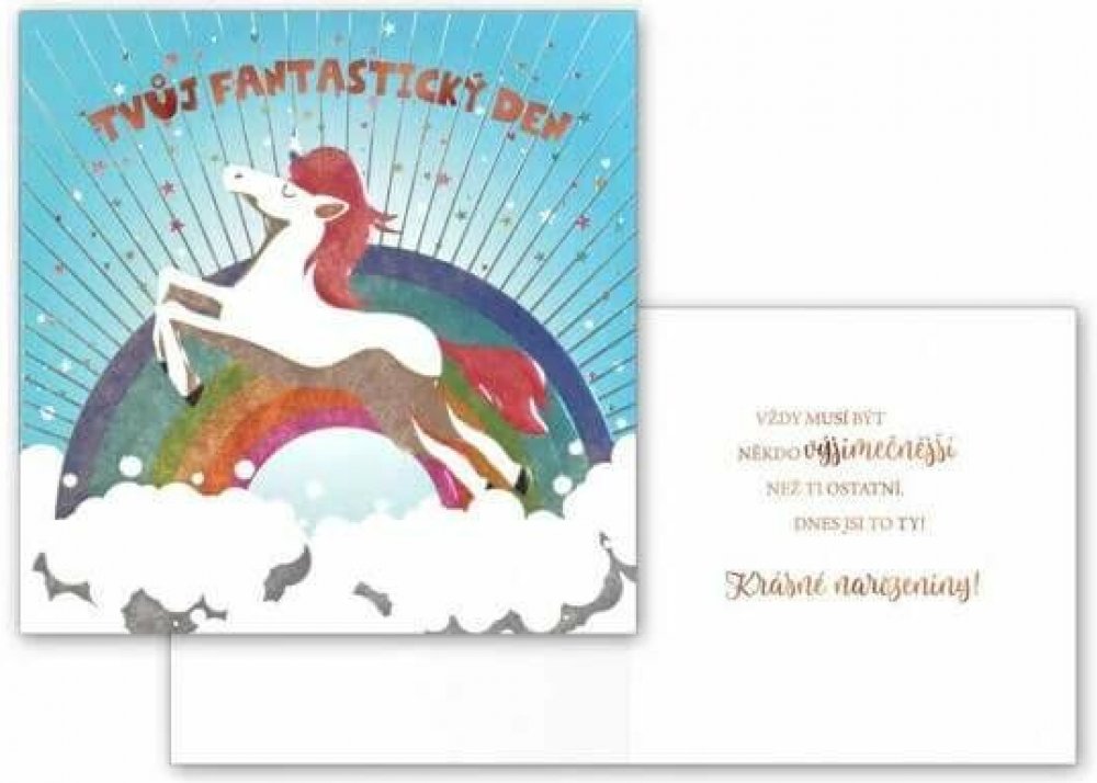 Narozeninové přání s motivem jednorožce a duhy je perfektní volbou pro všechny děti i dospělé, kteří milují pohádkové a barevné motivy. Přání má netradiční čtvercový tvar, který zaujme na první pohled, a jeho barevná duha spolu se skákajícím jednorožcem v oblacích dodává přání hravý a veselý charakter. Uvnitř najdete vtipný a přátelský vzkaz, který vykouzlí úsměv na tváři oslavenkyně nebo oslavenc...