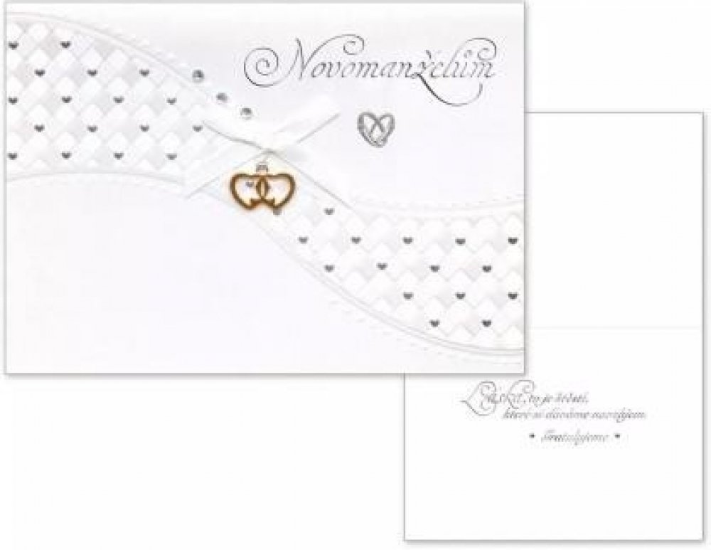 Přání MFP svatební CN 512. Svatební přání s textem - Svatba je příjemná a mimořádná událost a je začátkem nové etapy života. Mezi svatebními dary by nikdy nemělo chybět i přání novomanželům. Udělejte radost novomanželům a věnujte jim přání k jejich svazku, díky kterému si vždy připomenou krásné začátky jejich manželství. Nápis je vyrytý stříbrným písmem a na přání je mašlička se srdíčky. Text na přední straně přání: Novomanželům. Text uvnitř přání: Láska, to je štěstí, které si dáváme navzájem, Gratulujeme. Papír: pohlednicový karton 240 g. Uvedená cena je za 1 ks. Přání je baleno v sáčku. Součástí přání je i obálka.