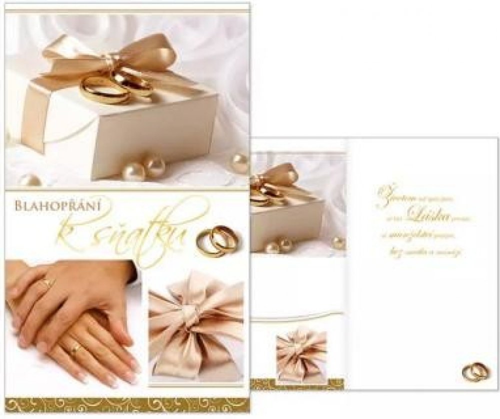 Přání MFP svatební M16 107 W. Svatební přání s textem - Svatba je příjemná a mimořádná událost a je začátkem nové etapy života. Mezi svatebními dary by nikdy nemělo chybět i přání novomanželům. Udělejte radost novomanželům a věnujte jim přání k jejich svazku, díky kterému si vždy připomenou krásné začátky jejich manželství. Nápis je vyrytý zlatým písmem a na přání jsou svatební motivy. Text na přední straně přání: Blahopřání k sňatku. Text uvnitř přání: Životem teď spolu jdete, ať Vás láska provází, ať manželství prožijete, bez smutku a nesnází. Papír: pohlednicový karton 240 g. Uvedená cena je za 1 ks. Přání je baleno v sáčku. Součástí přání je i obálka.