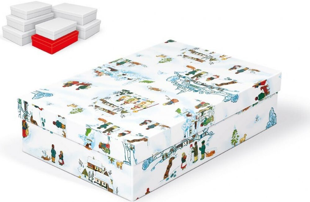 Vánoční dárková krabice s motivy Josefa Lady o rozměrech 28 x 18 x 7 cm Uvedená cena je za 1 ks. Materiál: 1,5 mm karton, potažený luxusním papírem.