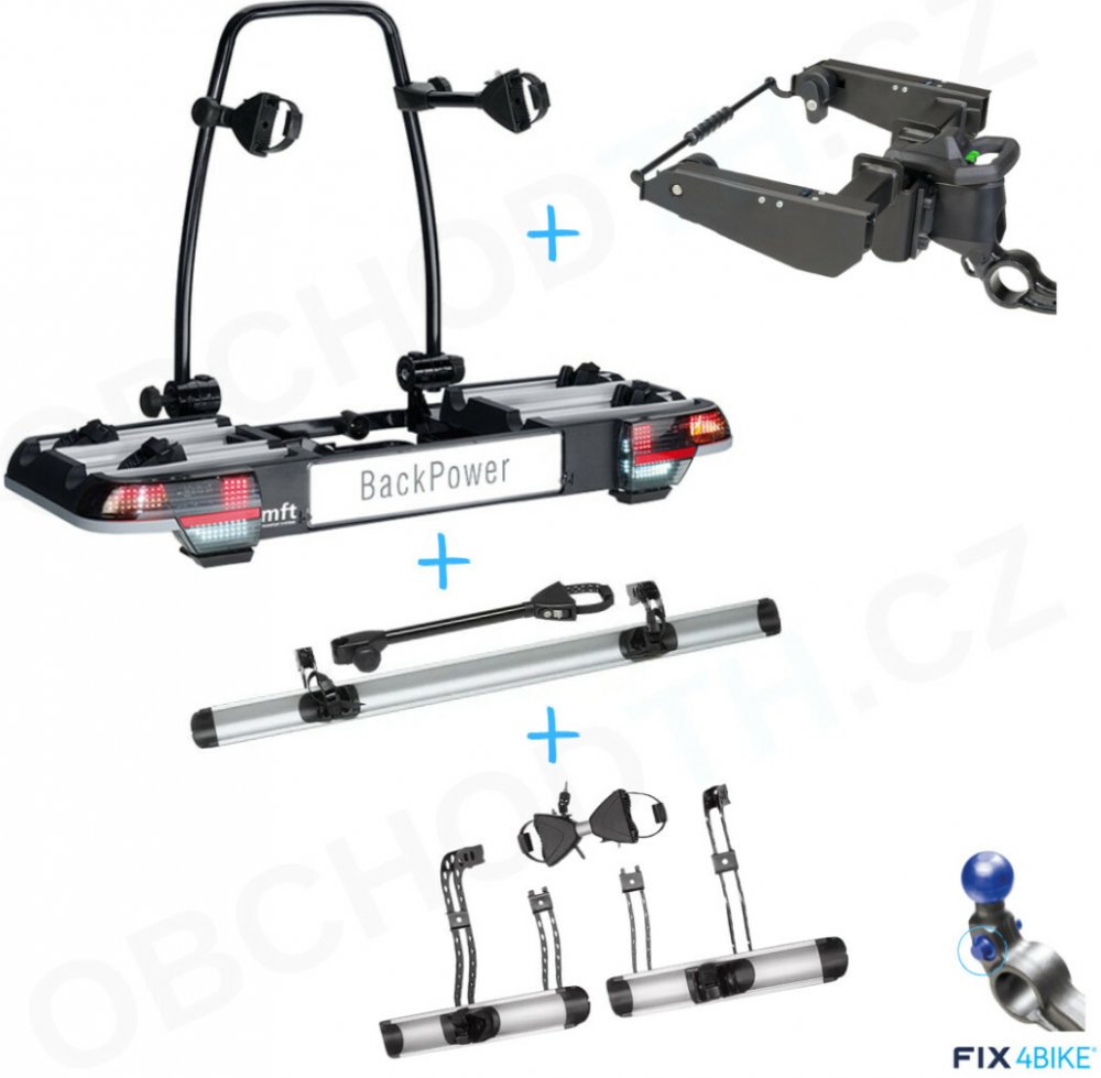 MFT 1202 BackPower + MFT 1203 BackCarrier Fix4Bike + MFT 1333 + MFT 1444 je ideální řešení pro přepravu až 4 kol, včetně elektrokol a MTB. Pevná konstrukce unese až 66 kg, široké žlábky zajišťují stabilitu a sklápěcí mechanismus umožňuje přístup do kufru. Snadná montáž bez nářadí usnadňuje manipulaci i skladování. Součástí setu je platforma BackCarrier potřebná k uchycení nosiče BackPower.