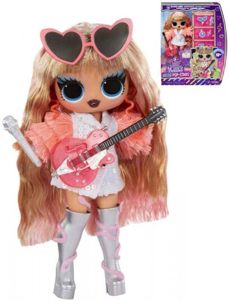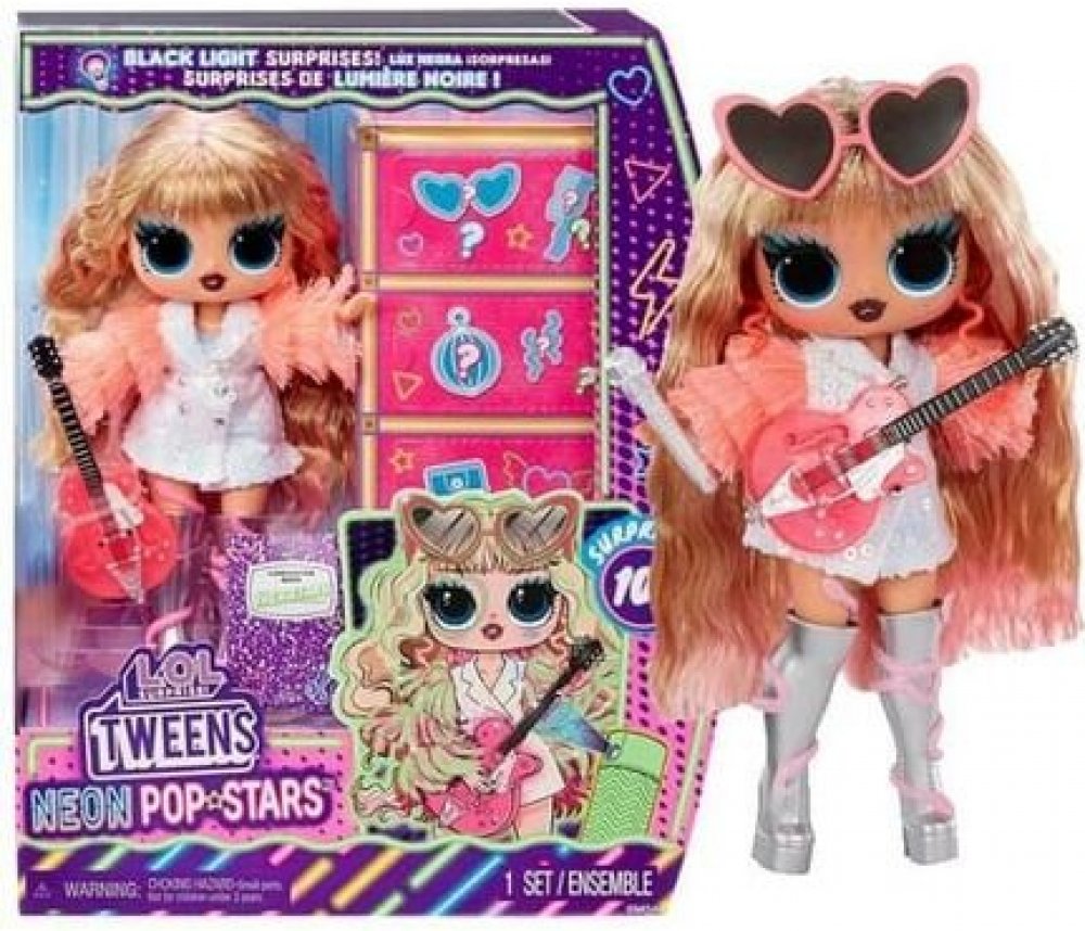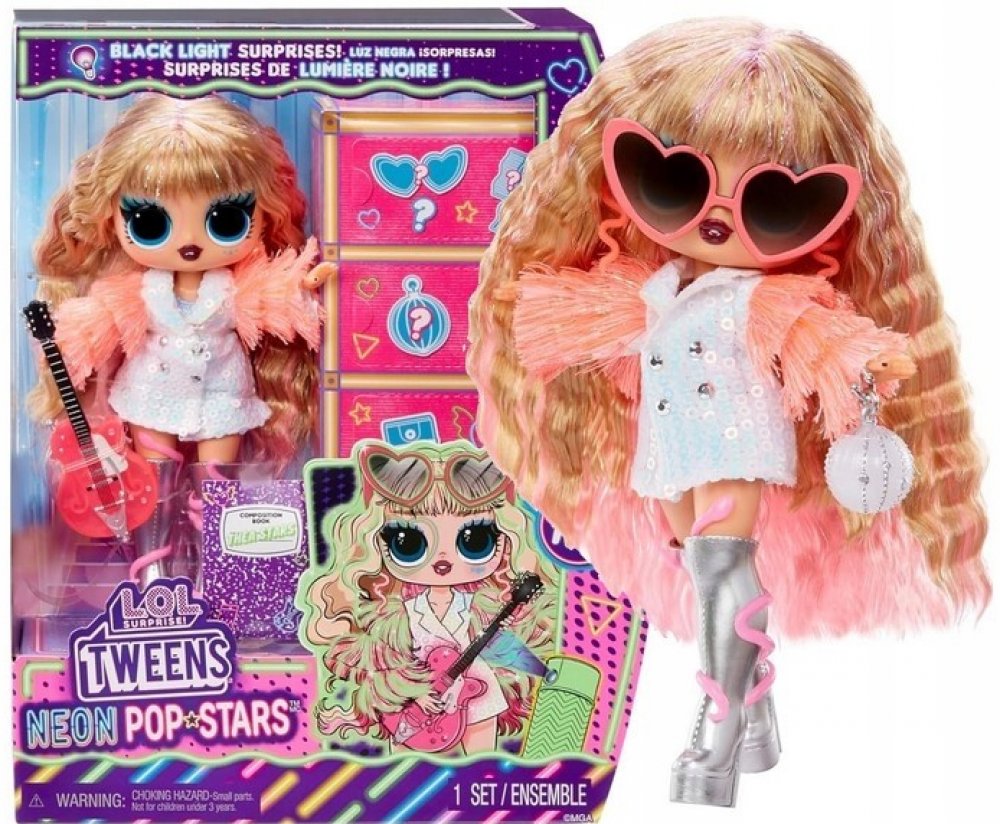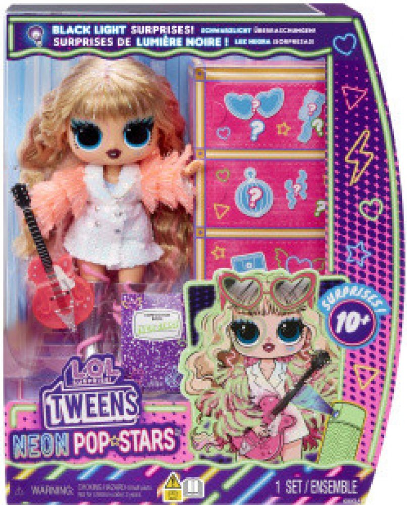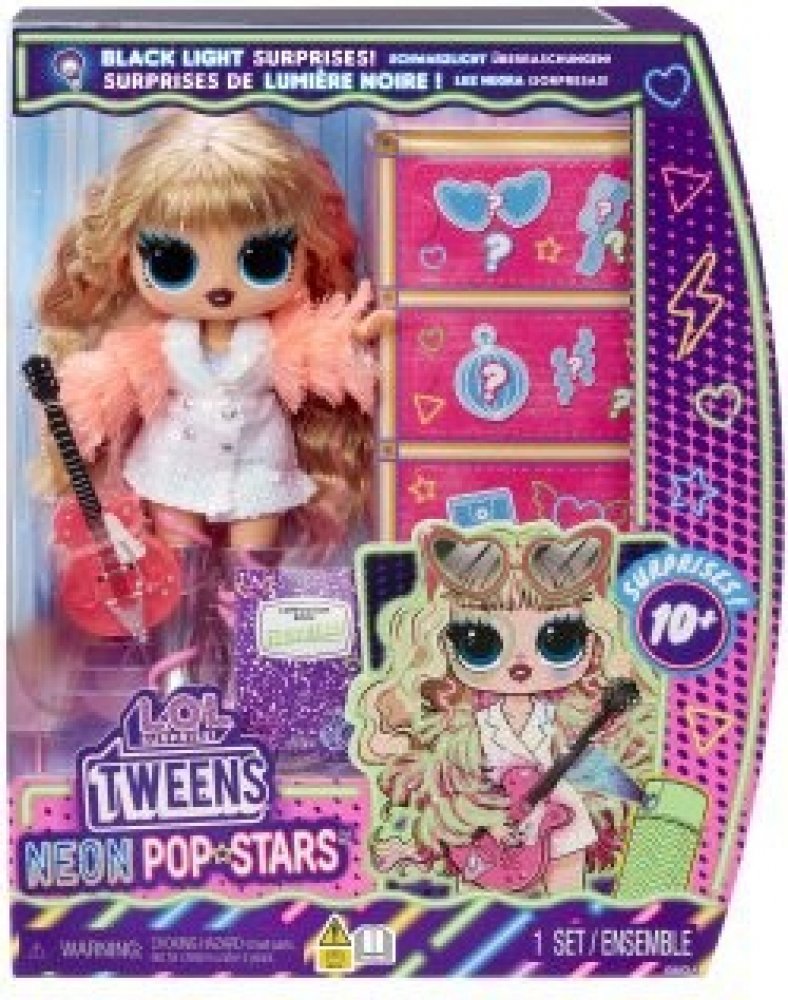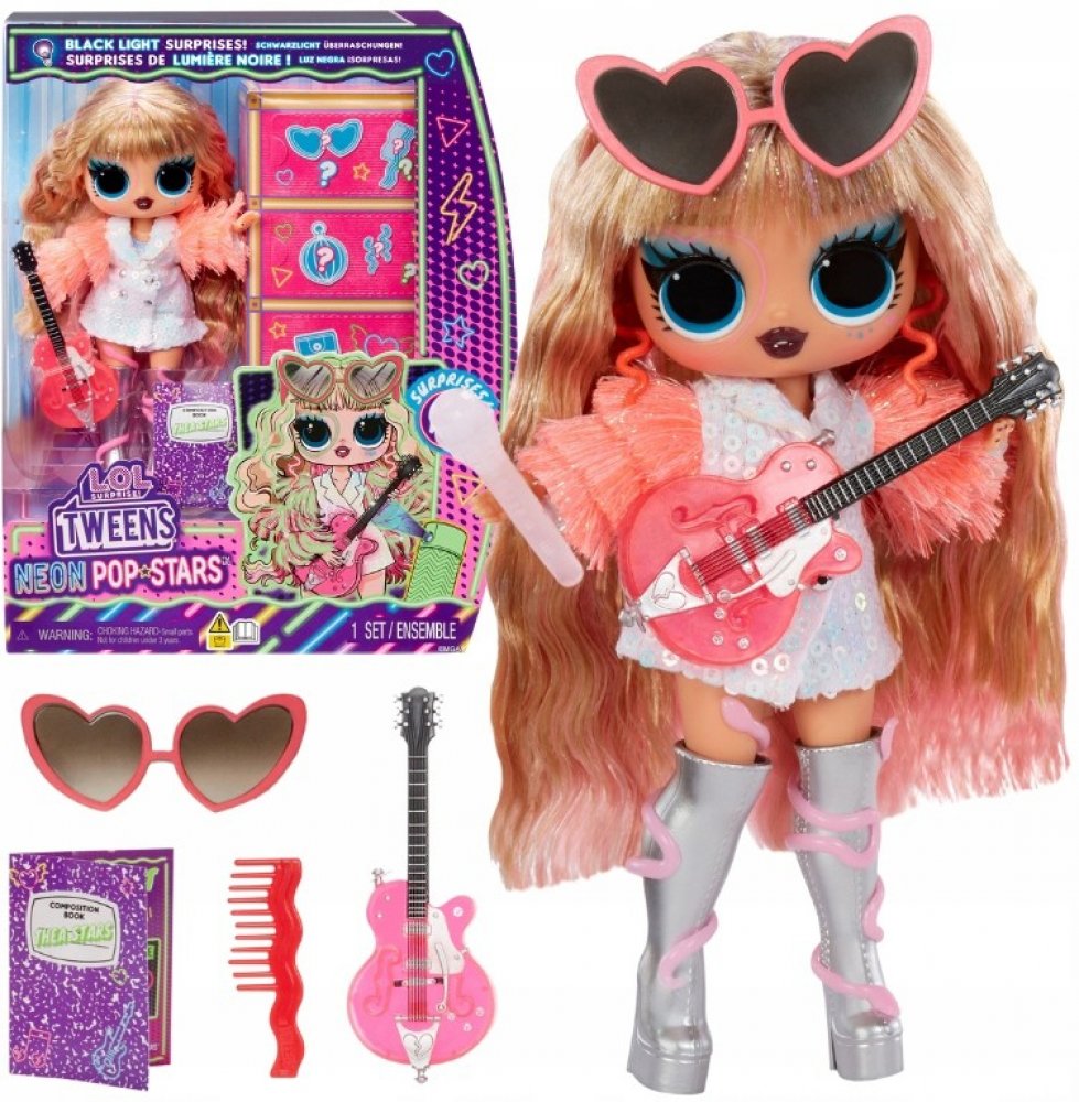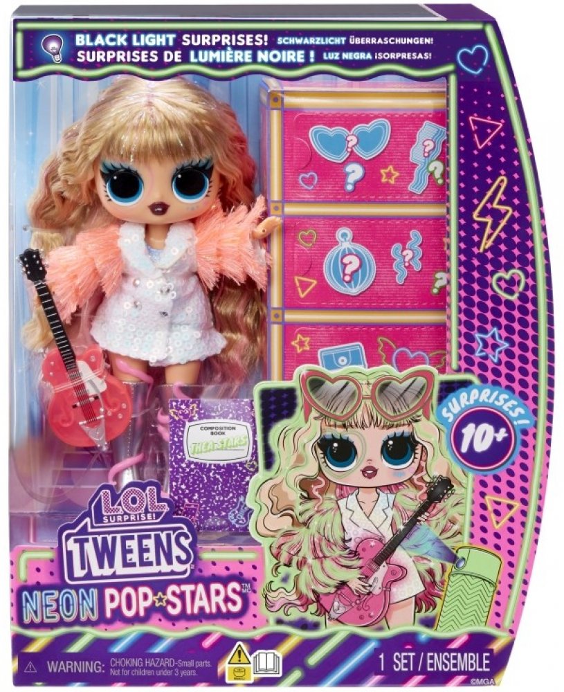 Postavte svou rošťáckou Tweens Neon panenku na pódium, kde zazáří ve stylovém outfitu dokonalou hrou na kytaru.