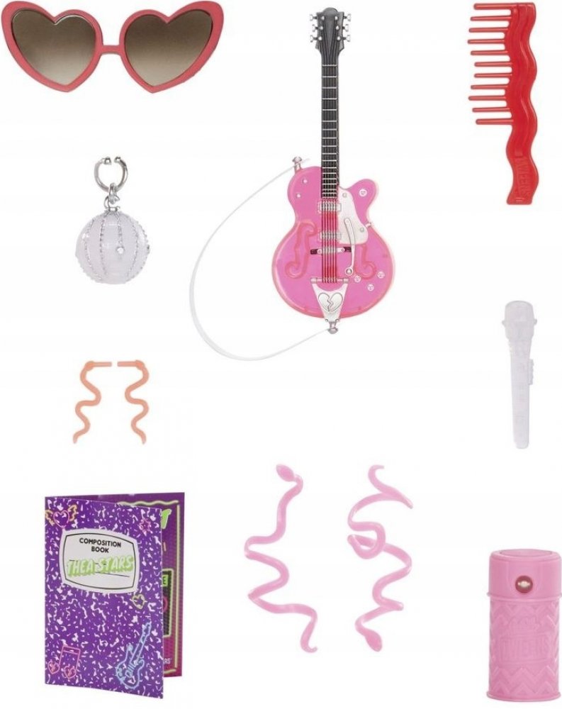 V balení najdete spoustu doplňků ve stylu popové hvězdy. Pokud na panenku posvítíte UV světlem, objeví se spousta neonových překvapení na jejím outfitu i doplňcích.