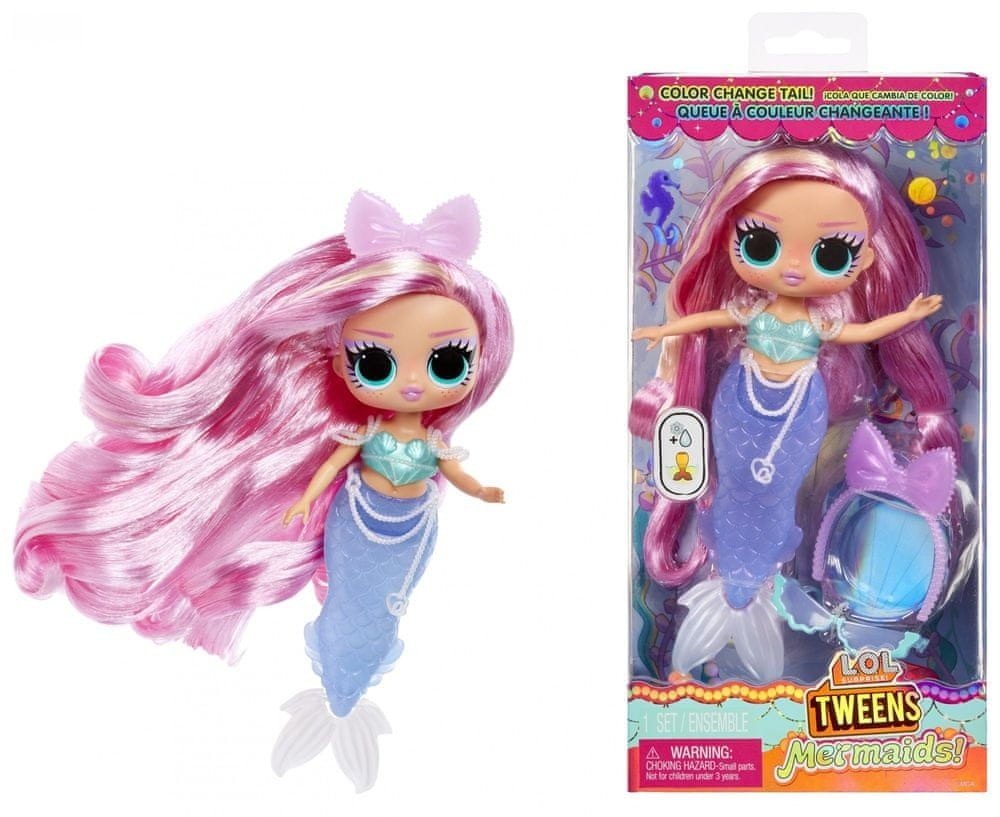 Ponořte se do okouzlujícího světa barevných kouzel a překvapení se zbrusu novou módní panenkou L.O.L. Surprise Tweens Mořská panna Lola Waves s oslnivými doplňky, které můžete rozbalit! Ponořte panenku Tweens Mořská panna do studené vody a sledujte, jak její ocas mění barvy z purpurové na sytě fialovou, čímž vytváří kouzelný podvodní zážitek ideální pro koupel a nápaditou hru! Lola Waves přináší kapku vzrušení díky své fascinující ploutvi, která se může pohybovat dopředu a dozadu! Nezapomeň panenku stylizovat jejími okouzlujícími doplňky včetně mořských stínů, čelenky z mořských mušlí a roztomilého perlového pásku! Panenka je kloubová a nabízí spoustu báječných pózovacích možností, včetně sezení, kdy se ohýbá v pase, a stání na ploutvi, abyste mohli panenku snáze stylizovat s větší stabilitou.