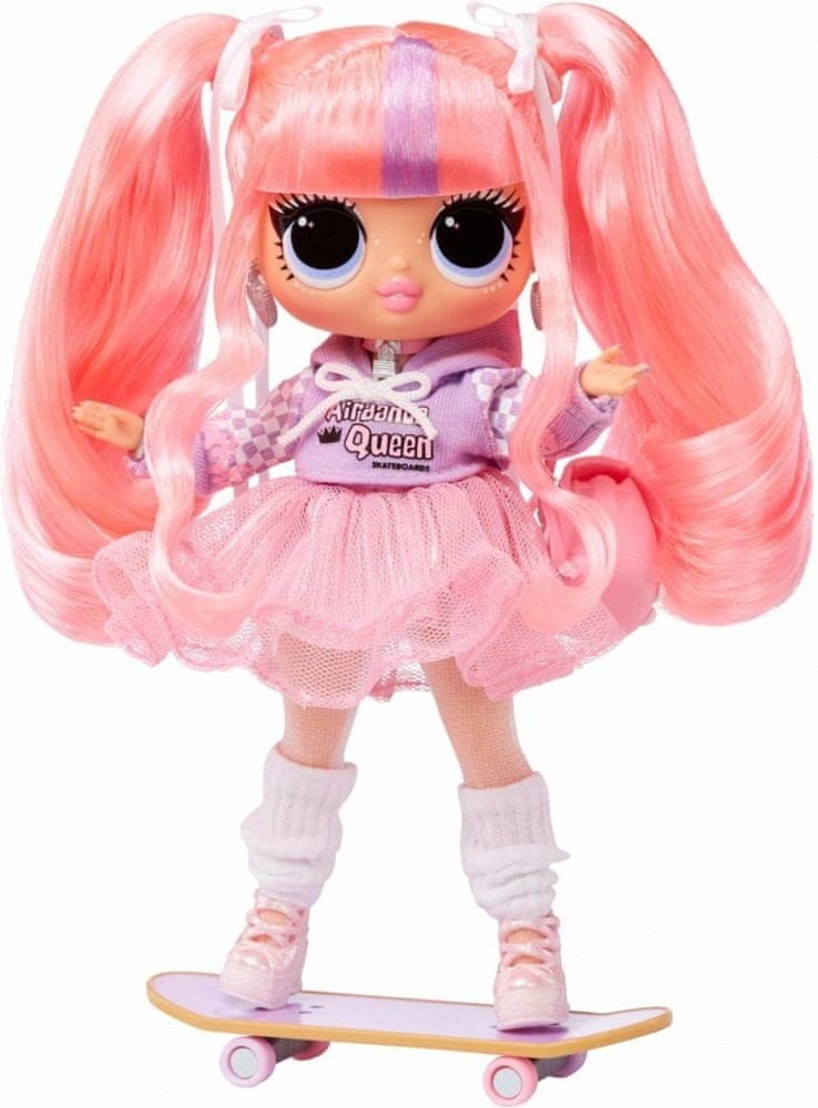 Představujeme zbrusu novou módní panenku LOL Surprise Tweens Ali Dance, velkou sestru milované postavy na Center Stage! Rozbalte 15 překvapení a sledujte, jak Ali tančí ve svém živlu, předvádí své kickflipy a triky na svém cool fialovém skateboardu a výrazné taneční pohyby ve stylovém růžovém topu a sukni!