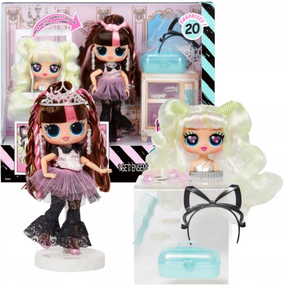 • Rozbalte více než 20 překvapení včetně stylingové hlavy, báječných outfitů, bot, síťovaných punčoch, diadém, perlový náramek, doplňky pro úpravu vlasů, kartáč na vlasy, stojánek pro panenky a další!