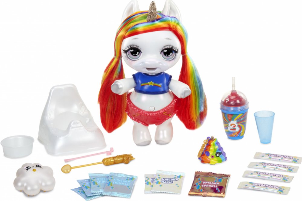 Sada Poopsie Surprise je také skvělá, kreativní zábava při vytváření pestrobarevných třpytivých slizů, protože magický jednorožec je hladový jednorožec, který můžete nakrmit, a po krmení vytvoří kouzelnou, třpytivou hromadu ve formě slizové hmoty. Vše, co musíte udělat, je nakrmit svého domácího mazlíčka, smíchat ingredience, dát domácího mazlíčka na nočník a stisknout tlačítko břicho.