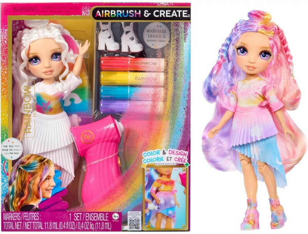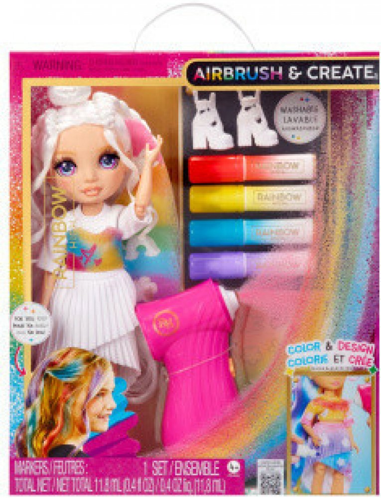 Rozměr balení cca 26 x 30,5 x 8 cm (D x V x Š).Cílem Rainbow High je podporovat kreativitu a sebevědomí prostřednictvím barev. Představujeme nový způsob, jak barevně stylovat panenku, kterou můžeš upravit podle své fantazie. Panenka je celá bílá, od hlavy až k patě, což ti umožní snadno vytvářet barevné variace a měnit její outfit nebo účes znovu a znovu. Můžeš použít omyvatelné fixy z balení v Airbrush pistoli nebo kreslit přímo na oblečení a vlasy. Poté stačí opláchnout a opakovat. Znovu a znovu.Obsah balení:1 panenka s pohyblivými klouby v kompletním outfitu1 airbrush pistole4 fixy1 hřeben1 šablona na různé vzory