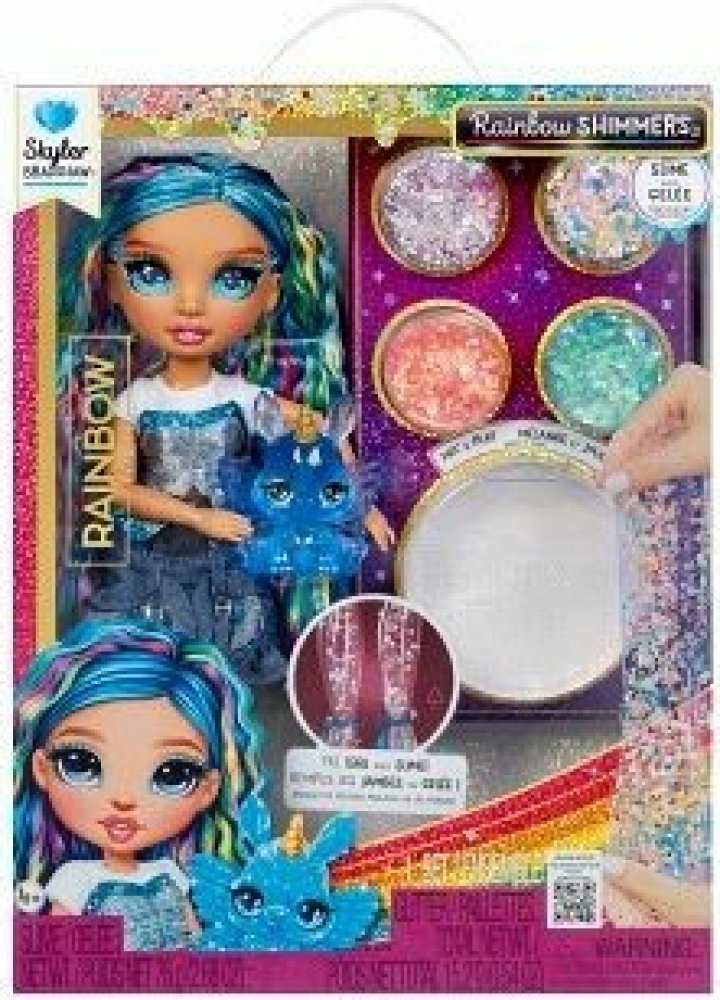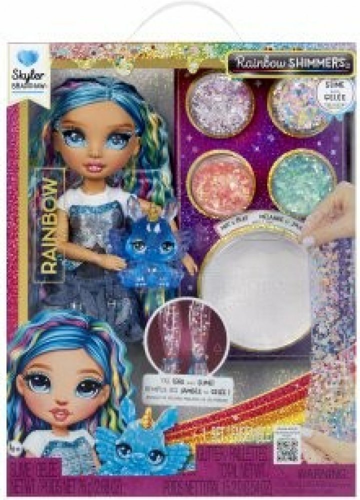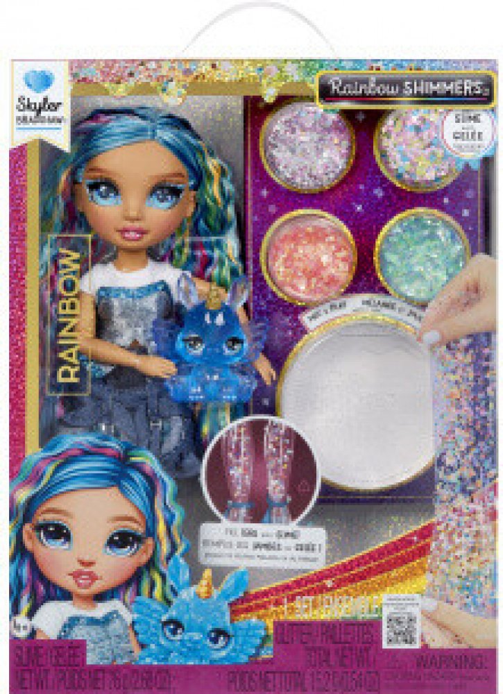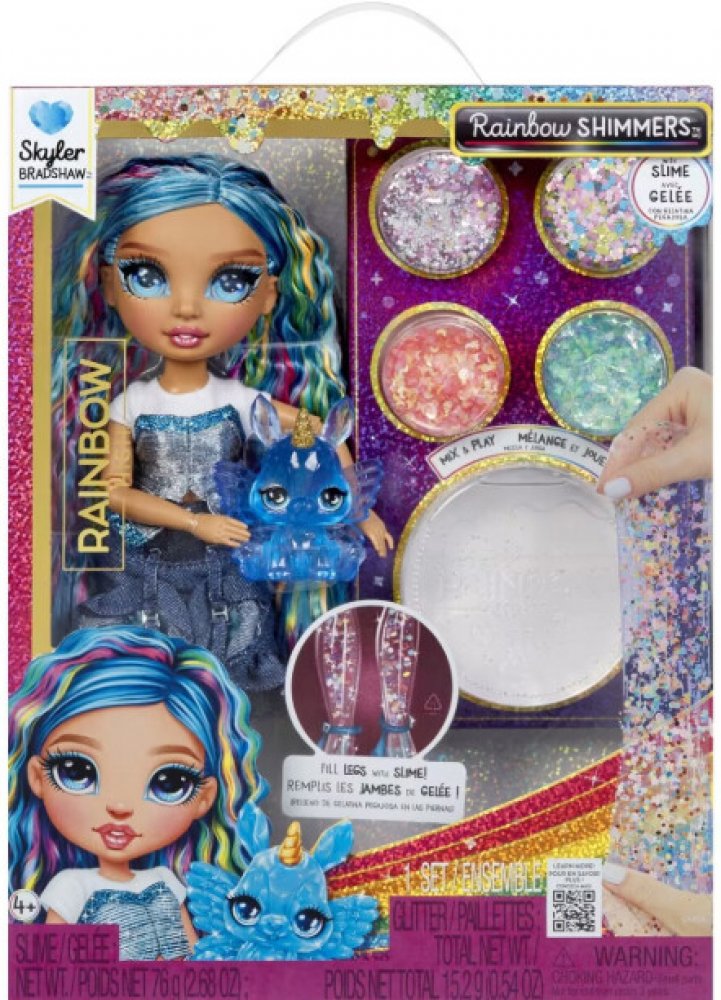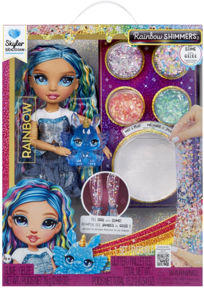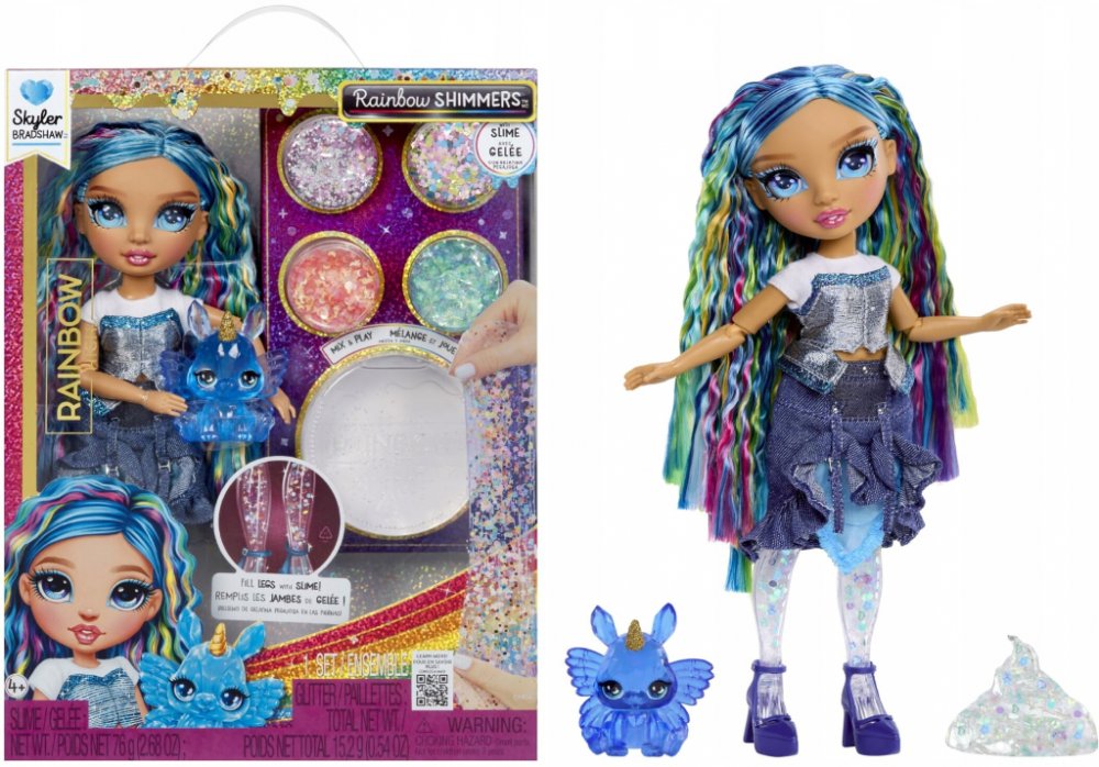 Rainbow High panenky jsou ještě kouzelnější! Společně se svými malými sestřičkami objevují nový svět, nové outfity a zcela nový způsob hraní. Každá panenka přichází s průhledným slizem a čtyřmi druhy třpytek. Třpytky přidej do slizu a uprav ho podle své fantazie. Poté sliz dej do průhledných nohou panenky a sleduj, jak se její nohy promění! Je to tak snadné! Sundej zadní část nohou, přidej sliz, zacvakni nohy zpět a můžeš si hned hrát! A to nejlepší? Můžeš to dělat znovu a znovu. Nebo můžeš třpytky a sliz kombinovat mezi různými panenkami. Obsah balení: panenka Skyler s dlouhými vlásky a 5 klouby, 1 outfit, 1 pár bot, 1 pár náušnic, průhledný sliz, 4 druhy třpytek, 1 kouzelný mazlíček. Doporučený věk 4+