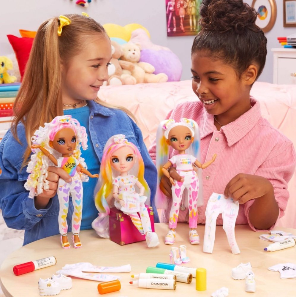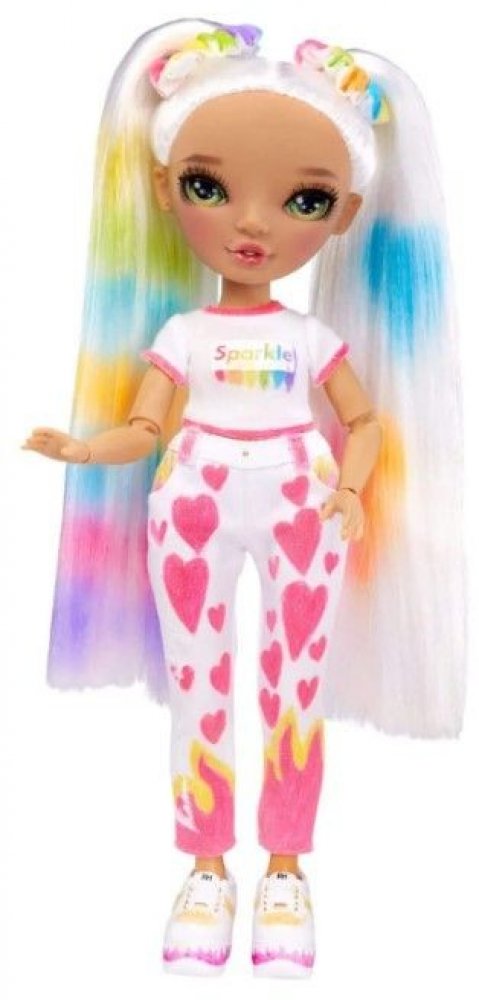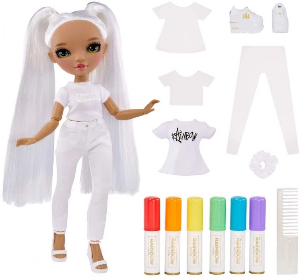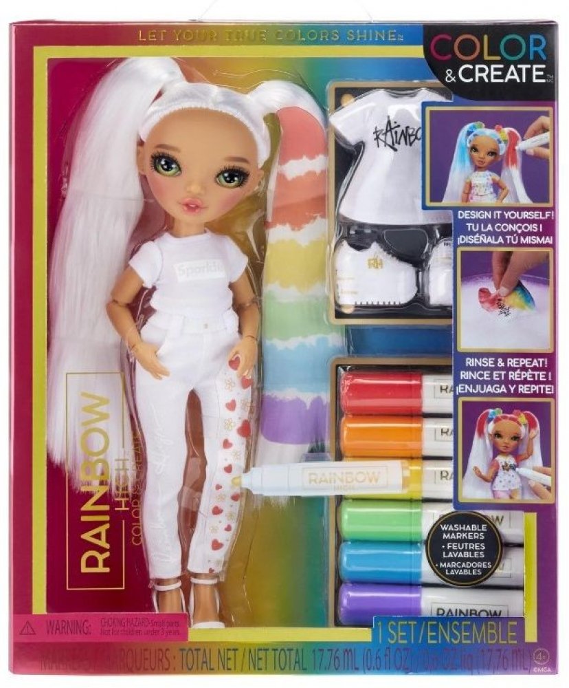 Duha má nekonečné množství barev a teď je na tobě, abys vytvořila vlastní Color panenku. Fashion panenka je oblečená od hlavy až k patě v bílé barvě, má bílé vlasy a ty můžeš vzít 6 omyvatelných fixů z balení a začít navrhovat. Vytvoř jednu ze svých oblíbených Rainbow High panenek nebo navrhni úplně novou. Pak stačí umýt vlasy a oblečení, nechat vše uschnout a začít znovu. Je to snadné. Navrhni, v...