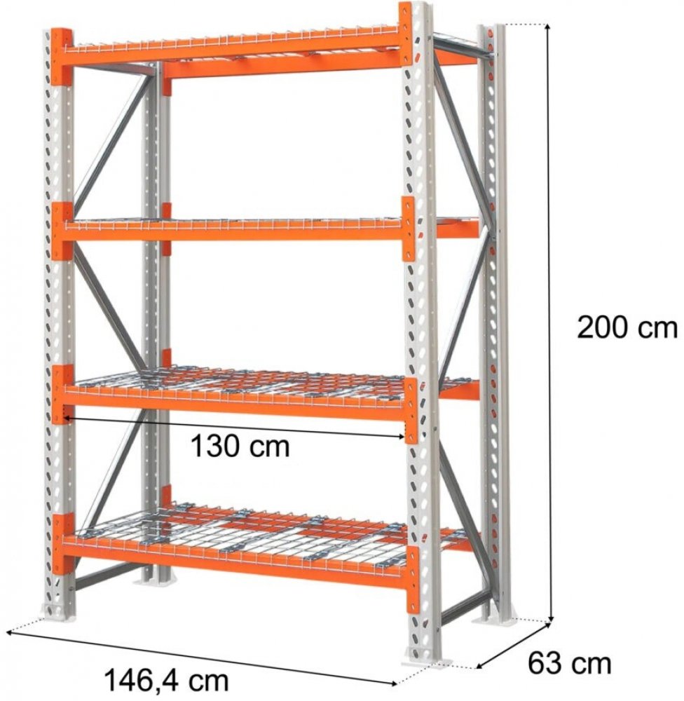 Kovový regál značky MAGO HX o výšce 200 cm, délce 146,4 cm a hloubce 63 cm, s rozměry polic 130 × 60 cm. Maximální nosnost jedné police je 300 kg při rovnoměrném rozložení zatížení.