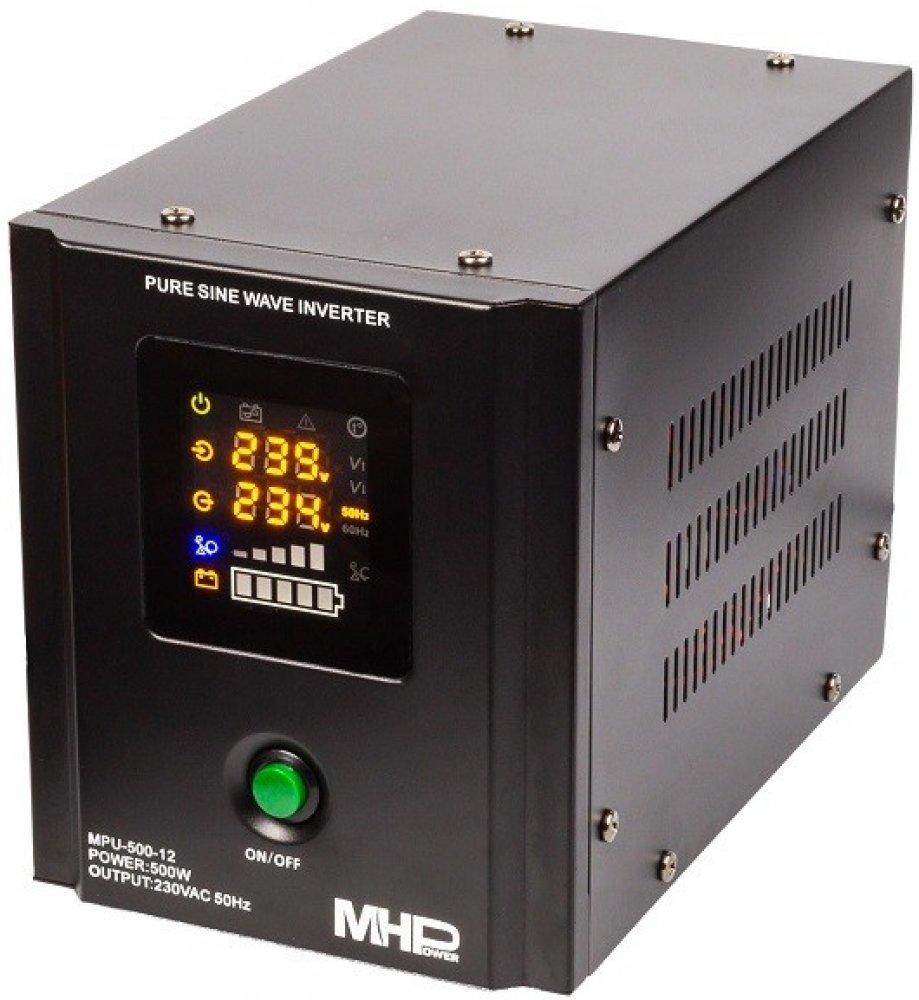 Záložní zdroj a napěťový měnič MPU-500-12 značky MHPower je ideální pro dlouhodobé zálohování. Je ideálním přístrojem pro své flexibilní použití a robustní celokovové provedení. Přístroj má zabudovanou ochranu proti přetížení, a to jak při napájení z baterie, tak i ze sítě. Maximální trvalý výkon činí 500 W.