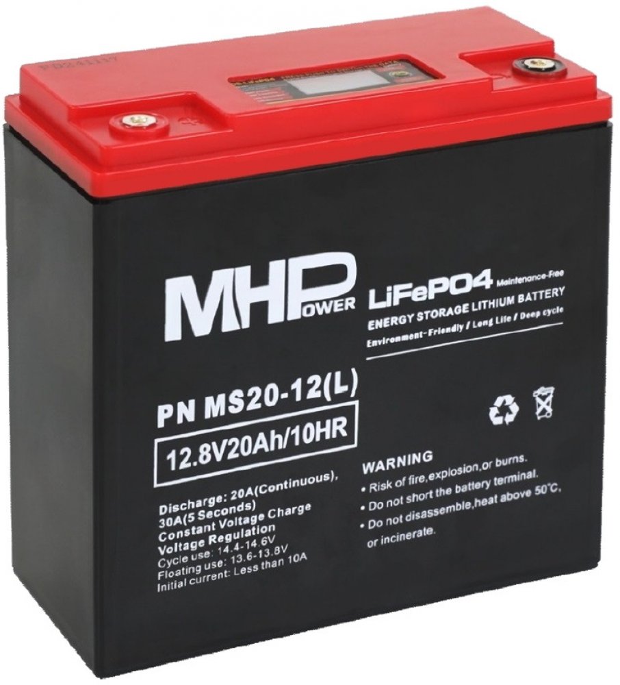 Lithiová baterie MHPower s kapacitou 20 Ah má výjimečnou životnost, nízkou hmotnost a integrovaný BMS systém pro bezpečné používání bez potřeby externí ochrany. Díky využitelné kapacitě až 94 % a nízké hmotnosti se hodí pro mobilní použití i domácí solární systémy.