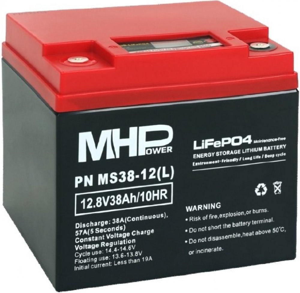 Lithiová baterie MHPower s kapacitou 38 Ah má výjimečnou životnost, nízkou hmotnost a integrovaný BMS systém pro bezpečné používání bez potřeby externí ochrany. Díky využitelné kapacitě až 94 % a nízké hmotnosti se hodí pro mobilní použití i domácí solární systémy.