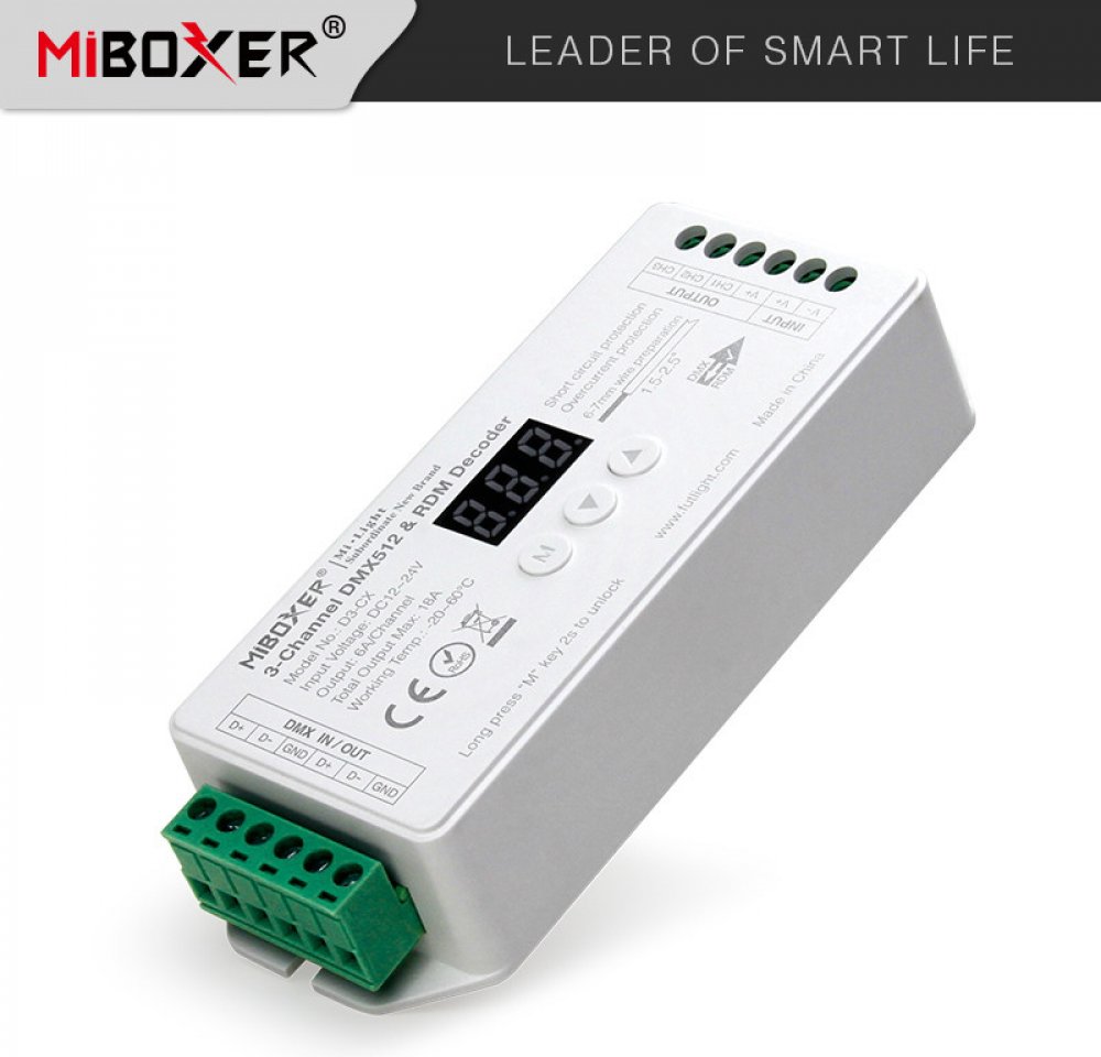 Mi-Light D3-CX DMX 512 dekodér DC 12-24V je 3-kanálový převodník určený pro ovládání RGB pásků pomocí DMX signálu. Maximální zatížitelnost 3x6A (18A).Klíčové vlastnosti:RDM obousměrná komunikace – nastavení DMX adresy z DMX konzole možnost volby PWM frekvence 2000hz nebo 500Hzmožnost volby způsobu stmívání - lineární nebo logaritmickédigitální displej k ručnímu nastavení DMX adresy