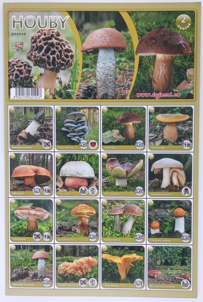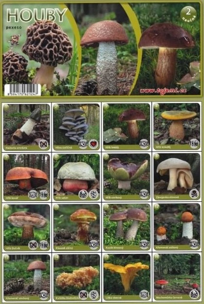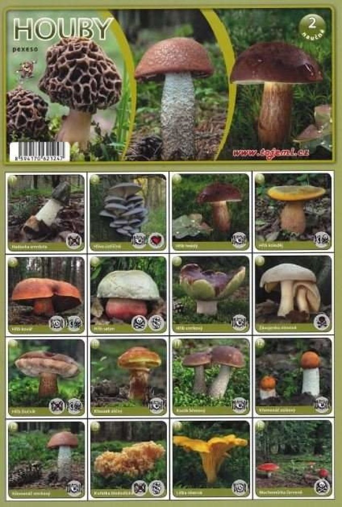 Pexeso věnované houbám vyskytujícím se na našem území, pomocí něhož se naučíte poznávat základní druhy hub. Mimo to se rovněž seznámíte s tím, jaké houby jsou jedlé a zdraví prospěšné, a které jsou naopak jedovaté. Po vystřižení získáte 32 dvojic kartiček. Součástí je také návod ke hře.