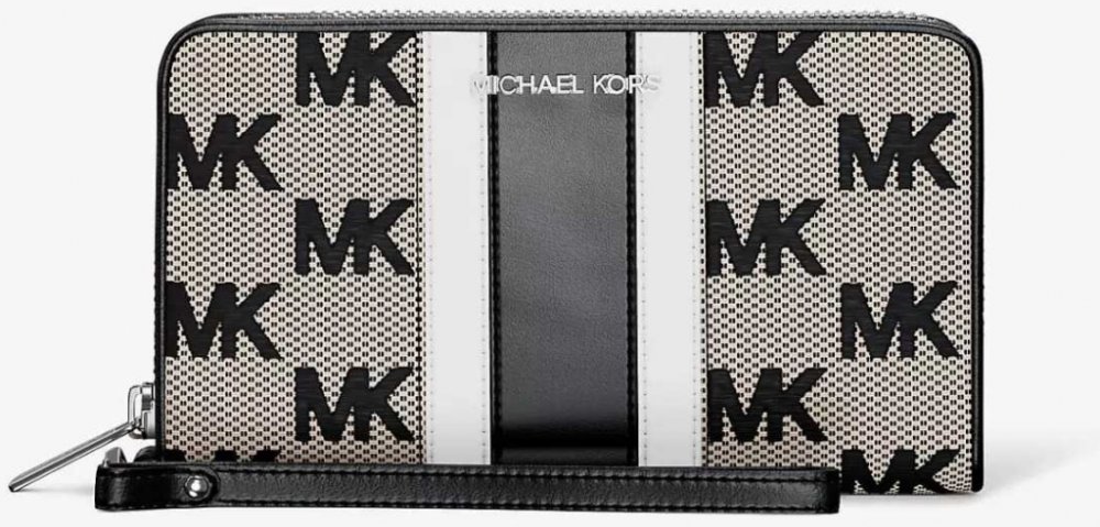 Peněženka je vyrobena z žakáru s logem a grafickými koženými pruhy a je ideálním společníkem na cesty. Otevírá se na zip a odhaluje řadu přihrádek na karty a zipovou kapsu na mince. Vložte ji do své oblíbené kabelky nebo ji noste za odnímatelný náramkový pásek. .