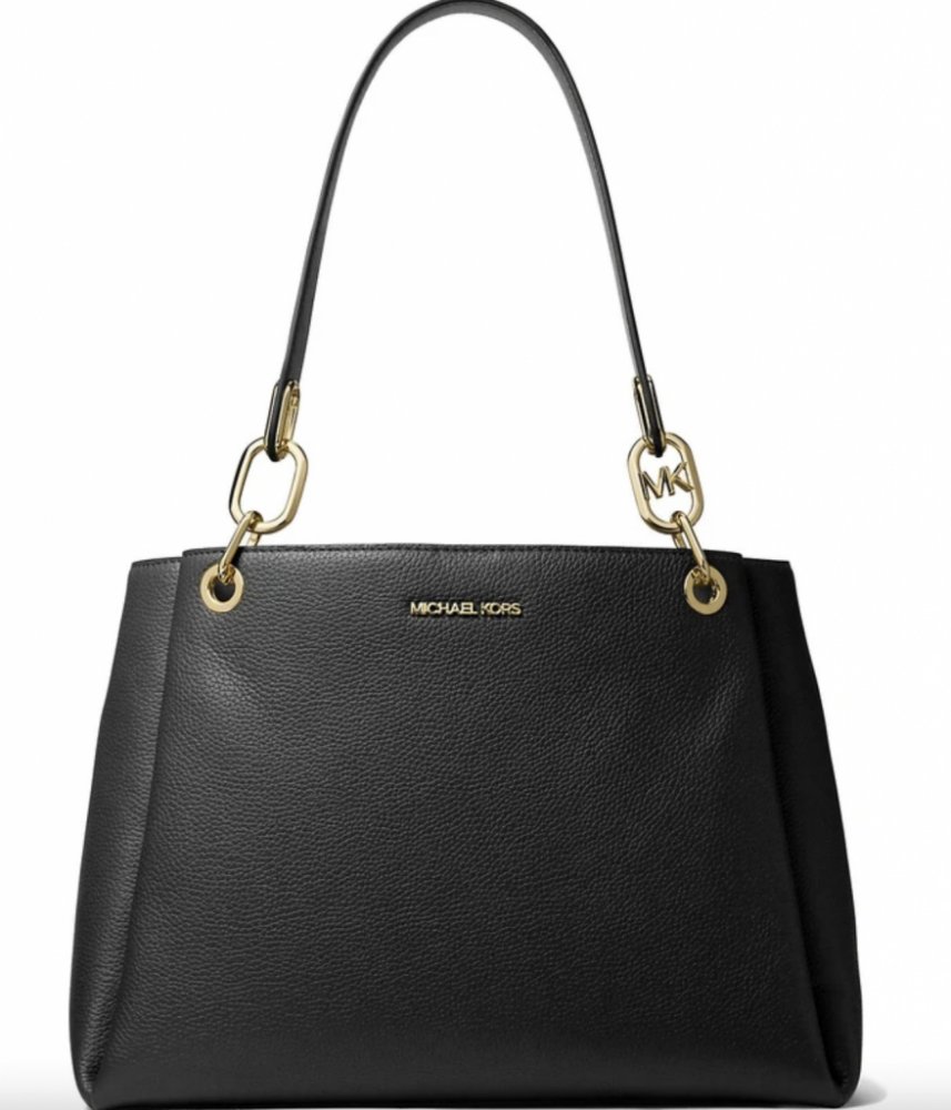 Kabelka je vhodná přes rameno. Rukojeti zdobí pozlacené logo MK.