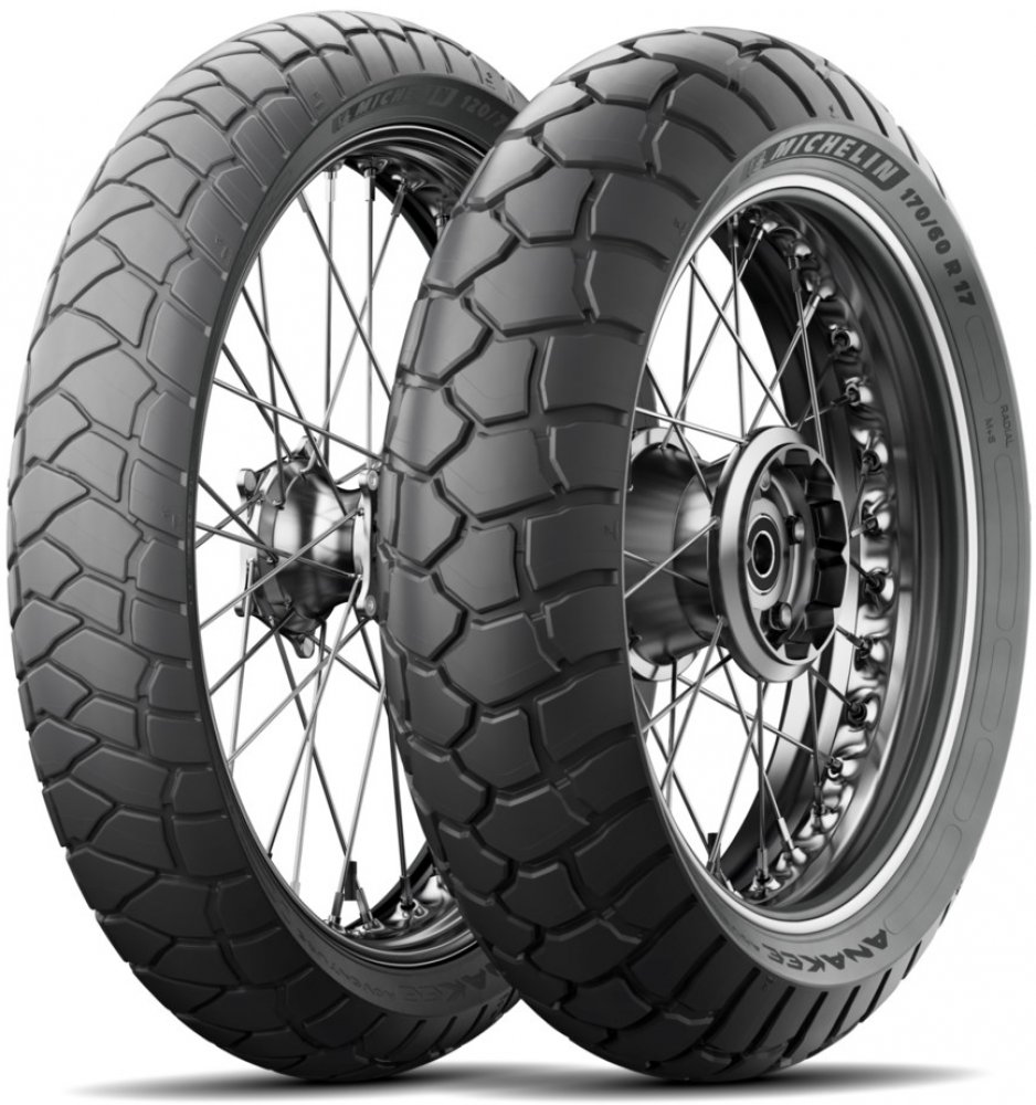 Michelin Anakee Adventure je všestranná pneumatika navržená pro enduro jezdce, kteří hledají perfektní kombinaci silničního výkonu a schopností v terénu. Přední pneumatika využívá tvrdší směs na bocích a měkčí ve středu, aby se předešlo nerovnoměrnému opotřebení a udržela stabilita řízení. Zadní pneumatika má směs uspořádanou obráceně, což zvyšuje životnost a výkon. Speciální můstky mezi sudými špalky zabraňují deformaci, čímž zajišťují optimální trakci v terénu a stabilitu na asfaltu. Uzavřený středový profil poskytuje skvělou přilnavost, stabilitu a dlouhou životnost, zatímco hluboké drážky po celé šířce běhounu zlepšují odvod vody a samočisticí schopnosti. Nové kaučukové směsi nabízejí vynikající přilnavost za mokra i sucha, při zachování nízkého opotřebení. Díky označení M+S je pneumatika ideální pro celoroční použití, a navíc je homologována jako originální vybavení pro BMW R 1250 GS. Michelin patří mezi největší světové výrobce pneumatik. Michelin patří mezi přední výrobce taky díky kvalitě, výkonu a životnosti svých pneumatik jak v zimě, tak i v létě. Michelin vyrábí pneumatiky k nejrůznějším vozidlům: pro osobní automobily, nákladní vozidla, motocykly, stroje pro zemní práce, autobusy.