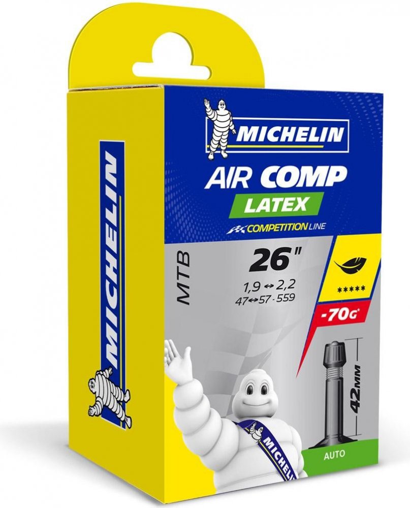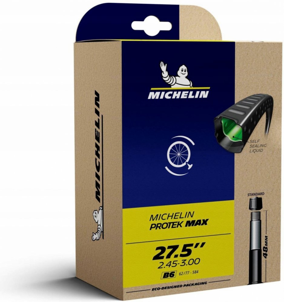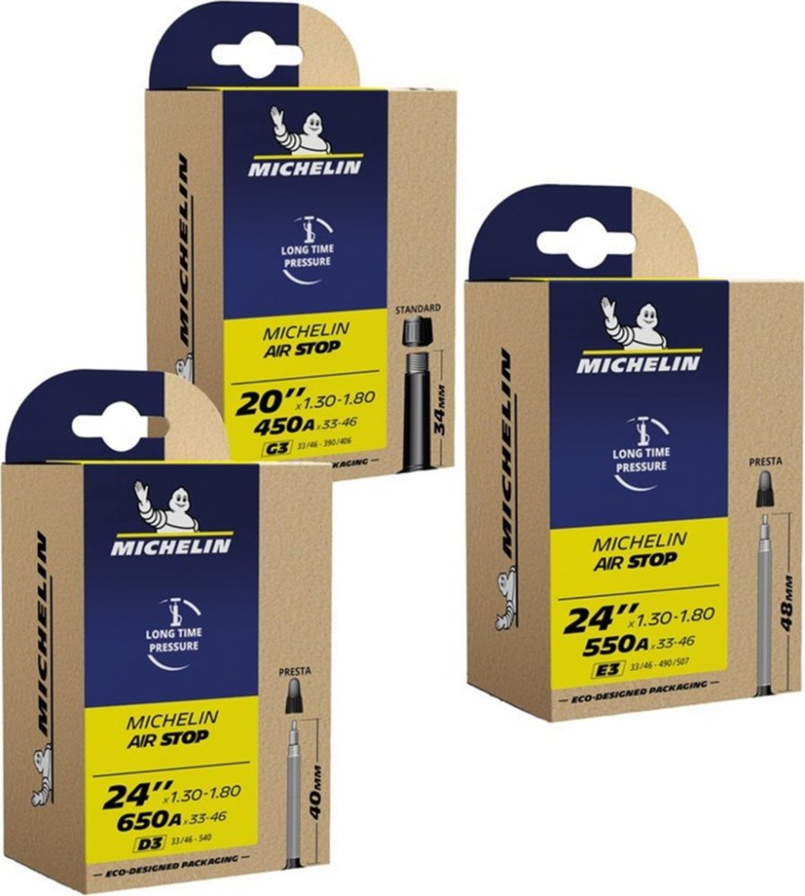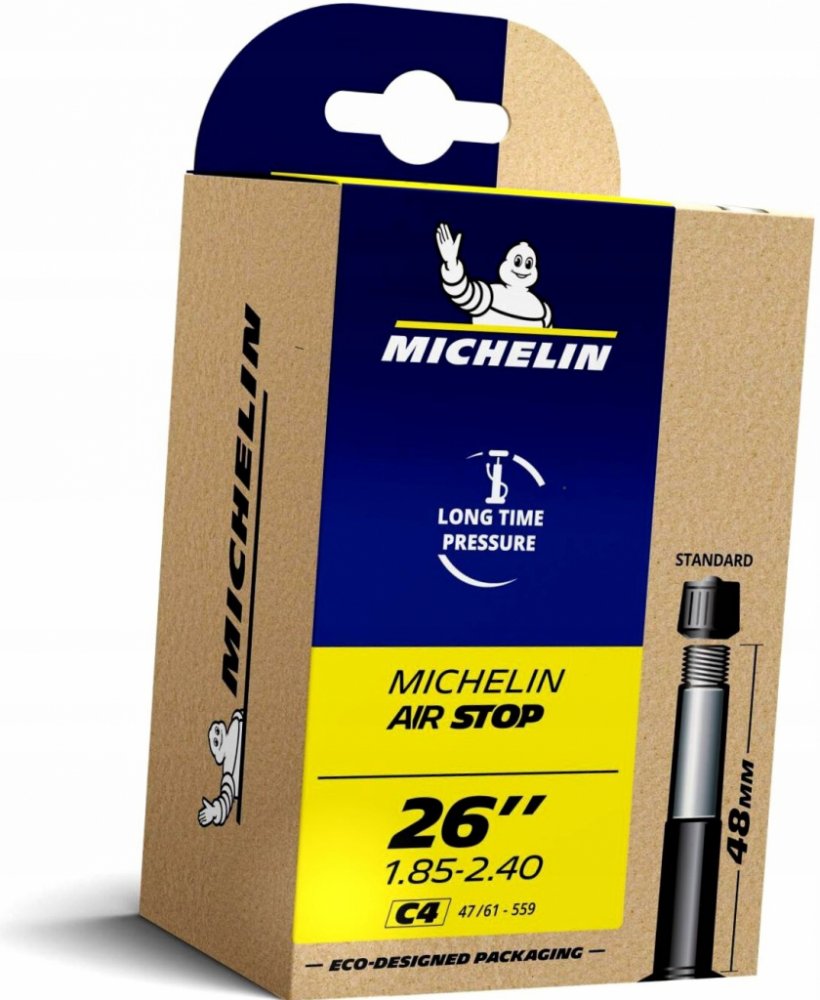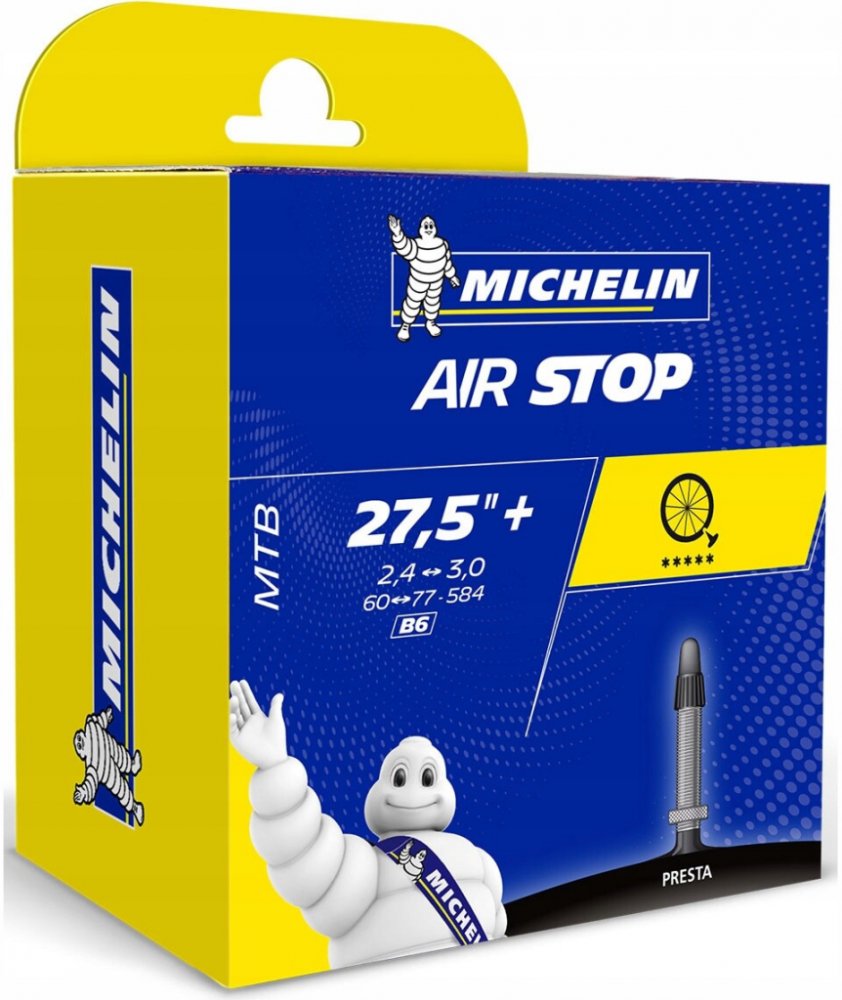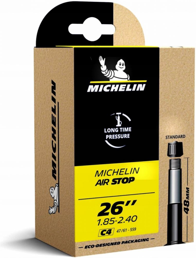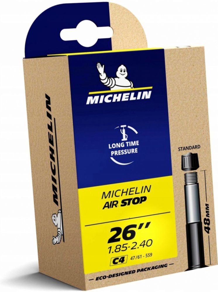MICHELIN Airstop A4 MTB 29 29 x 1,9/2,5 (autoventilek) Velmi kvalitní 29" mtb duše od špičkového výrobce Řada duší Michelin Airstop Butyl splňuje potřeby každodenních cyklistů jak po stránce ekonomické, tak po stránce kvality. Vyznačuje se dobrou odolností proti propíchnutí a dlouhou výdrží, to vše podložené bezvadnou reputací Michelinu. Duše na kterou se můžete spolehnout.Jak má Michelin v logu - lepší cesta vpřed. AIR STOP = Účinnější ochrana proti propíchnutí. - délka ventilku 34 mm ( schrader - auto) - Vyrábí se ve velikosti dle rozměru pláště 29x1,90 - 29x2,50 ( 48-622 / 62-622) - Od výrobce balená v krabičce. - hmotnost : 220 gr Michelin je francouzská společnost, která vyrábí pneumatiky. Nedílnou součástí loga firmy a maskotem je Michelin Man, tzv. Bibendum. Ročně je vyrobeno okolo 190 milionů pneumatik.