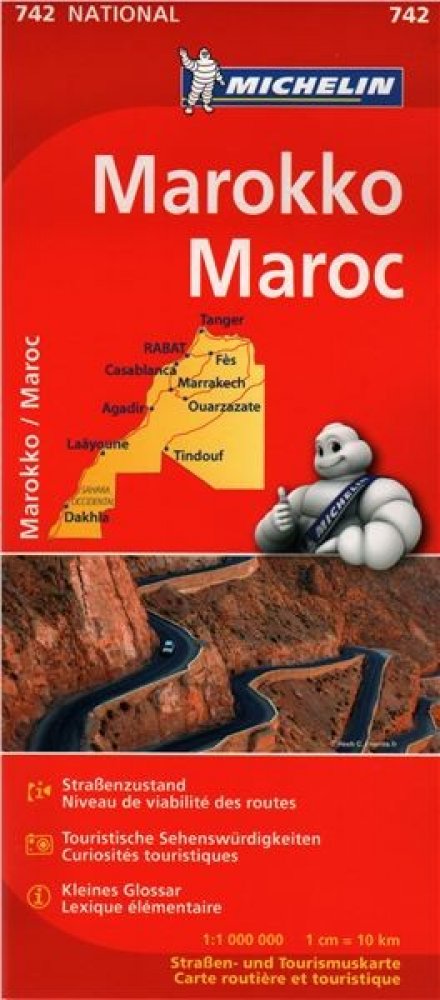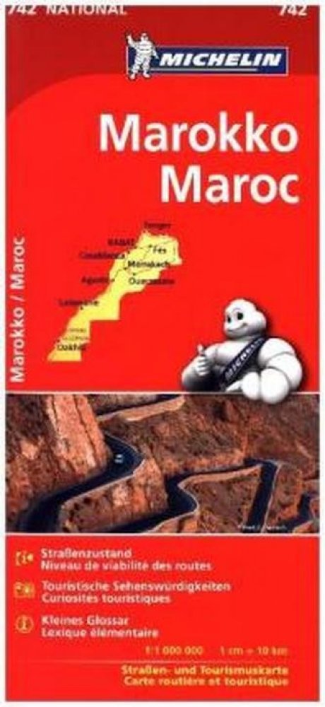 Michelin mapa Maroka vč. Západní Sahary 1:1 000 000 a podrobněji 4 regiony v měřítku 1:600 000 (Marakéš a Vysoký Atlas; Střední Atlas od El Kelaa des Sraghna po Boulemane; Meknes, Fes a Rif; a konečně oblast Casablanky a Rabatu).