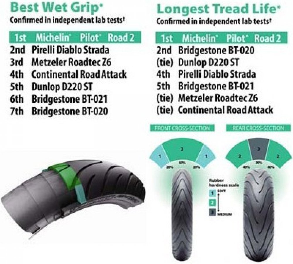 Osvědčená silničně sportovní pneumatika pro každého silničního jezdce. Ačkoliv již mají svého nástupce v podobě Michelinu Pilot Road 3, stále je Michelin Pilot Road 2 vynikající silniční pneumatikou stojící v popředí své kategorie. Již legendární pneumatika vyvinutá v roce 2007 vyrobená na základě technologie MotoGP vyhrála ve srovnávacích testech snad vše co se dalo. Dvousložková směs využívající technologie Michelin 2CT má lepší přilnavost při vysokém náklonu a zároveň vysokou životnost díky tužšímu středu dezénu Oproti předchůdci, modelu Michelin Pilot Road má druhá generace vylepšený vzor dezénu, který zásadně zlepšuje odvod vody zpod pneumatiky. Samozřejmostí dále zlepšující chování na mokru je guma plněná silikou. Významně tak zlepšuje bezpečnost jízdy. Zapracovalo se však také na jízdním komfortu. Výhody pneumatiky jen korunuje vynikající kilometrový výkon daný mimo jiné dvousložkovou technologií Michelin 2CT. Pro ještě tvrdší supersportovní až okruhové užití je dále určena pneumatika Michelin Power Pure.