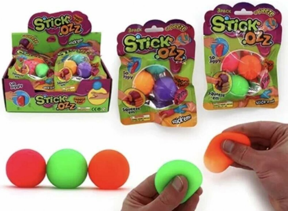 Stick’Ozz jsou měkké, extrémně poddajné a lehce lepivé antistresové míčky, které můžeš mačkat, natahovat a házet na hladké povrchy. Díky speciálnímu povrchu se po kontaktu přichytí ke stěně, oknu, koulovně, dlažbě či zárubním – a po chvíli se samy pomalu odlepí a spadnou dolů.